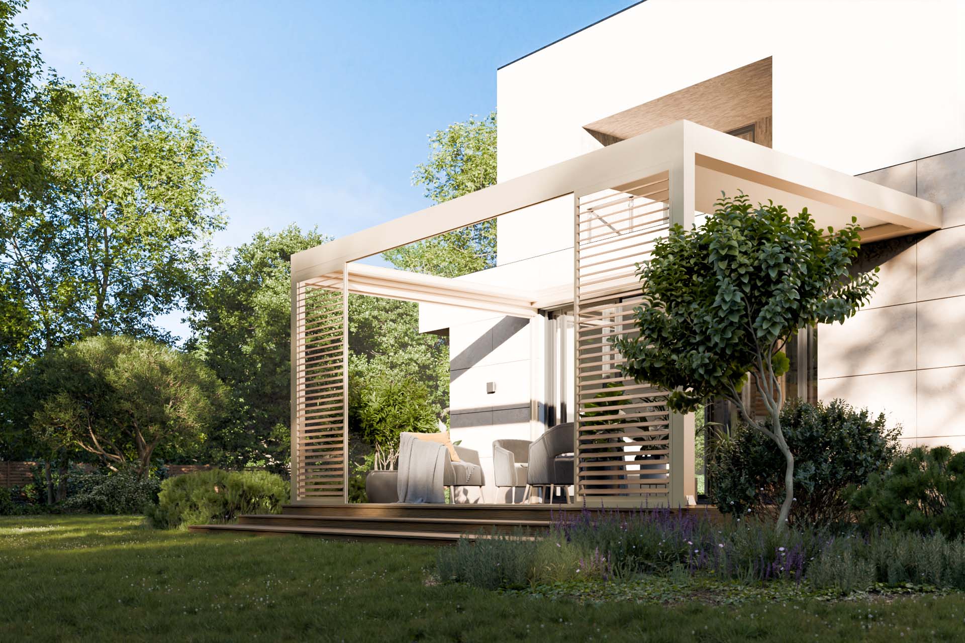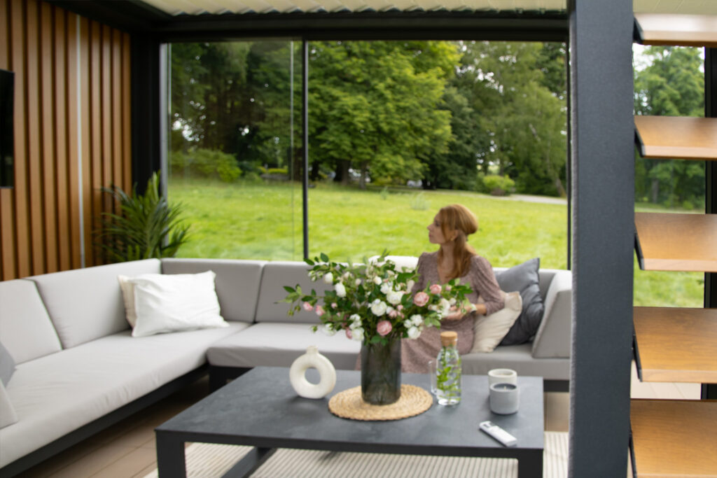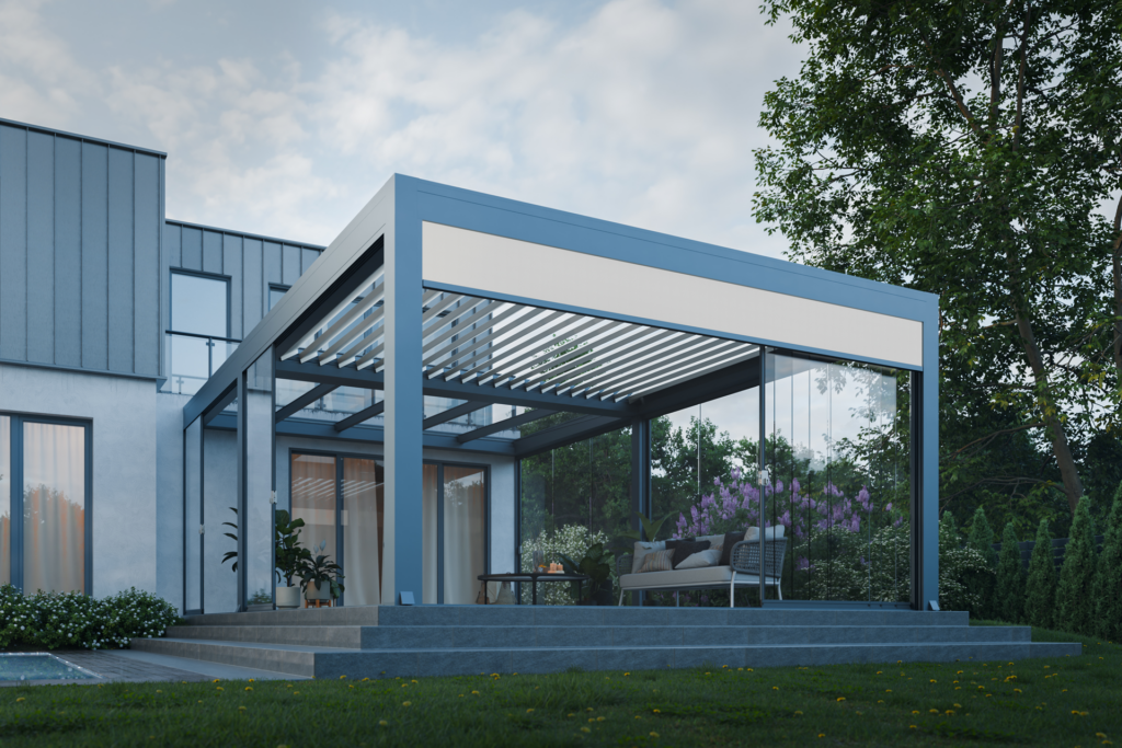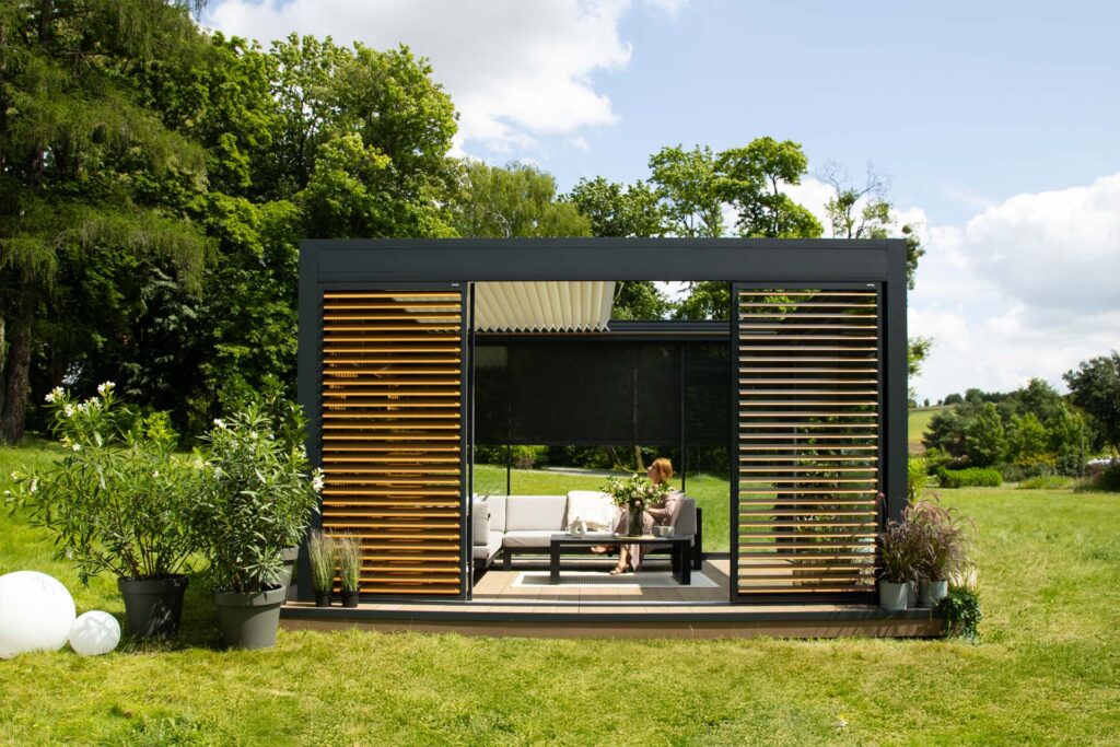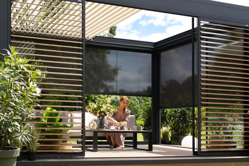 Z kolei dzięki pełnej zabudowie bocznej może powstać niemal całoroczne pomieszczenie z widokiem na ogród, chronione od wiatru i chłodu, ale nadal pełne światła. W tym celu możesz wykorzystać rolety ZIP, shuttersy, przeszklenia lub panele stałe.