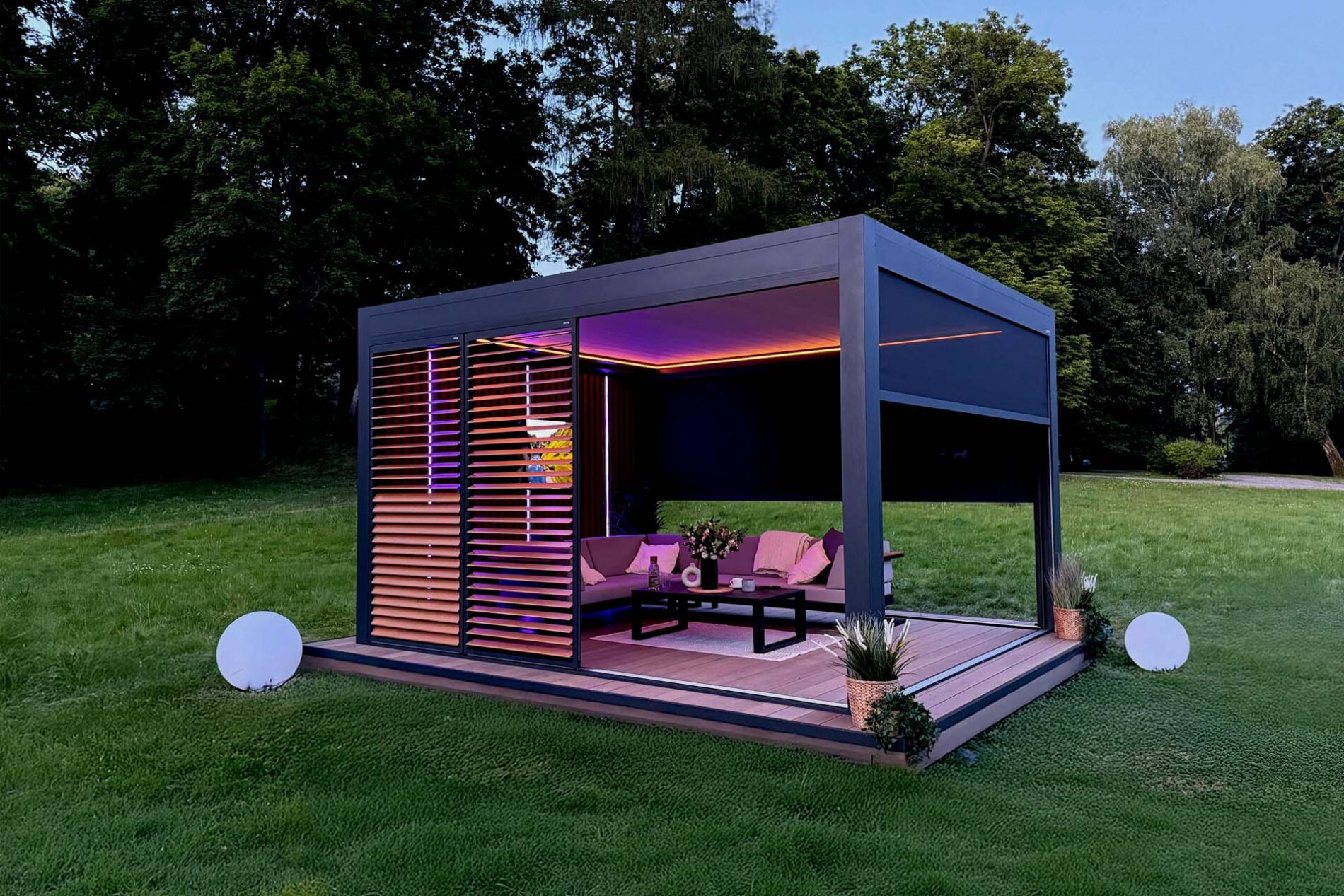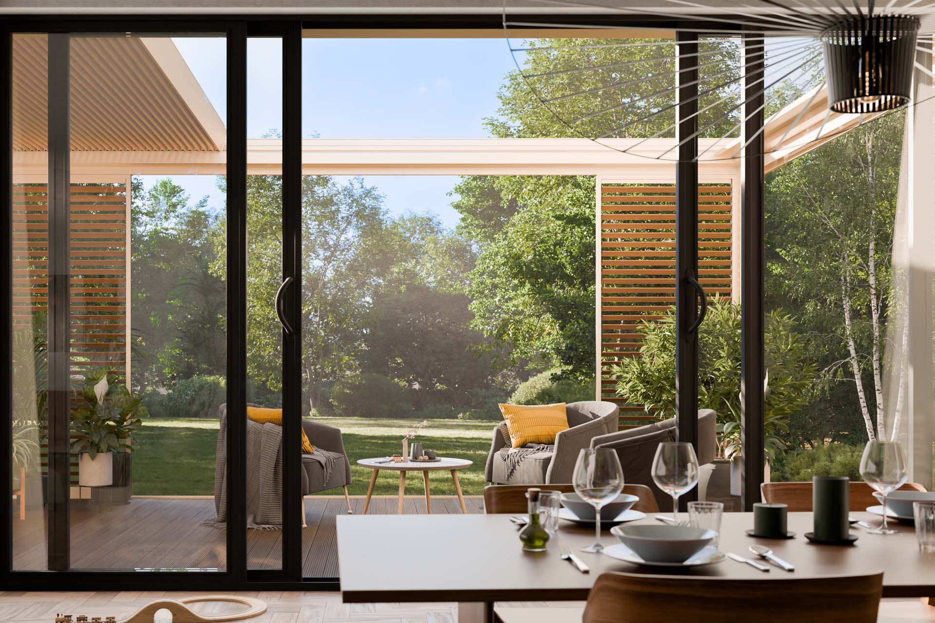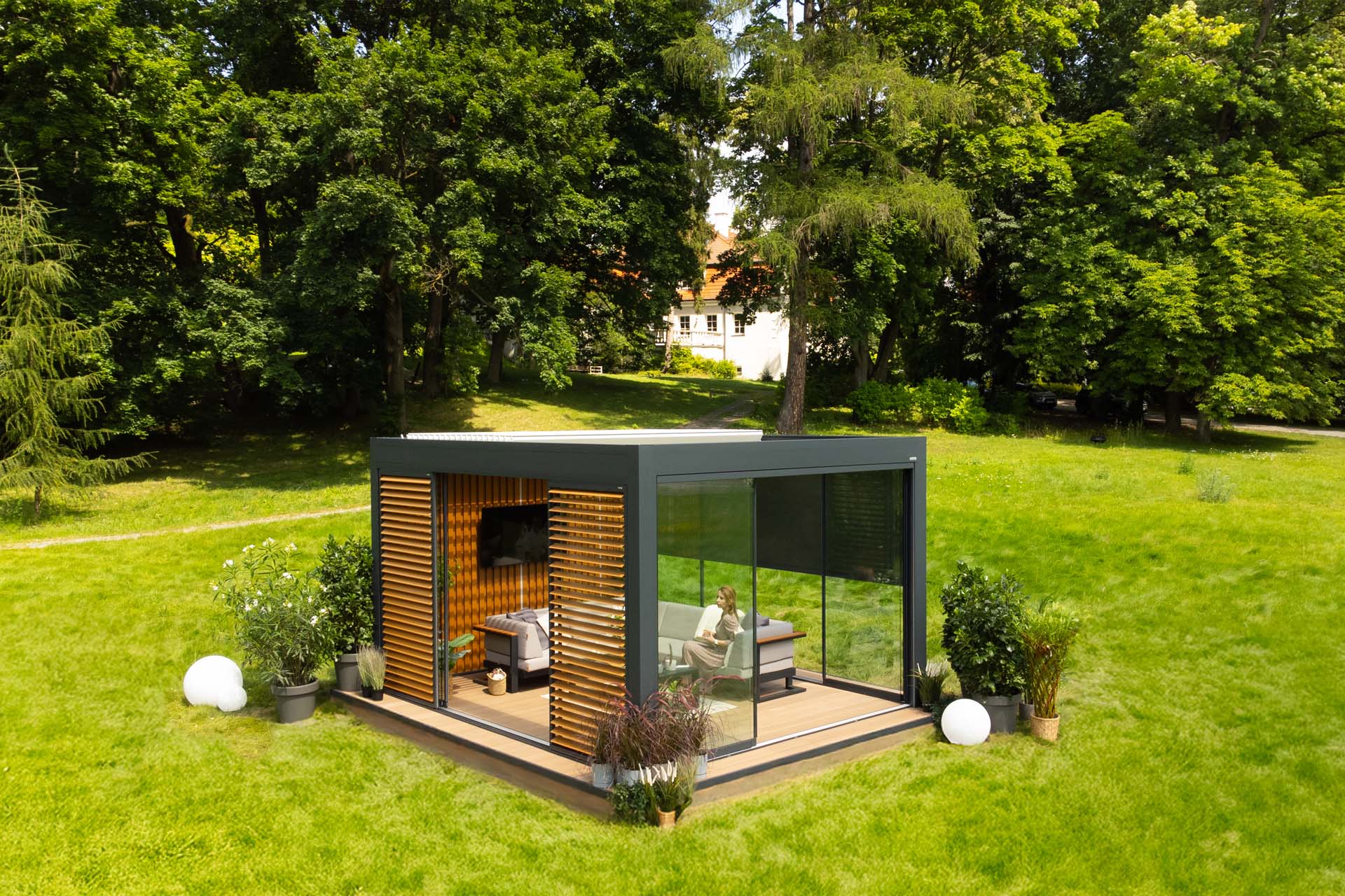 Z kolei dzięki pełnej zabudowie bocznej może powstać niemal całoroczne pomieszczenie z widokiem na ogród, chronione od wiatru i chłodu, ale nadal pełne światła. W tym celu możesz wykorzystać rolety ZIP, shuttersy, przeszklenia lub panele stałe.