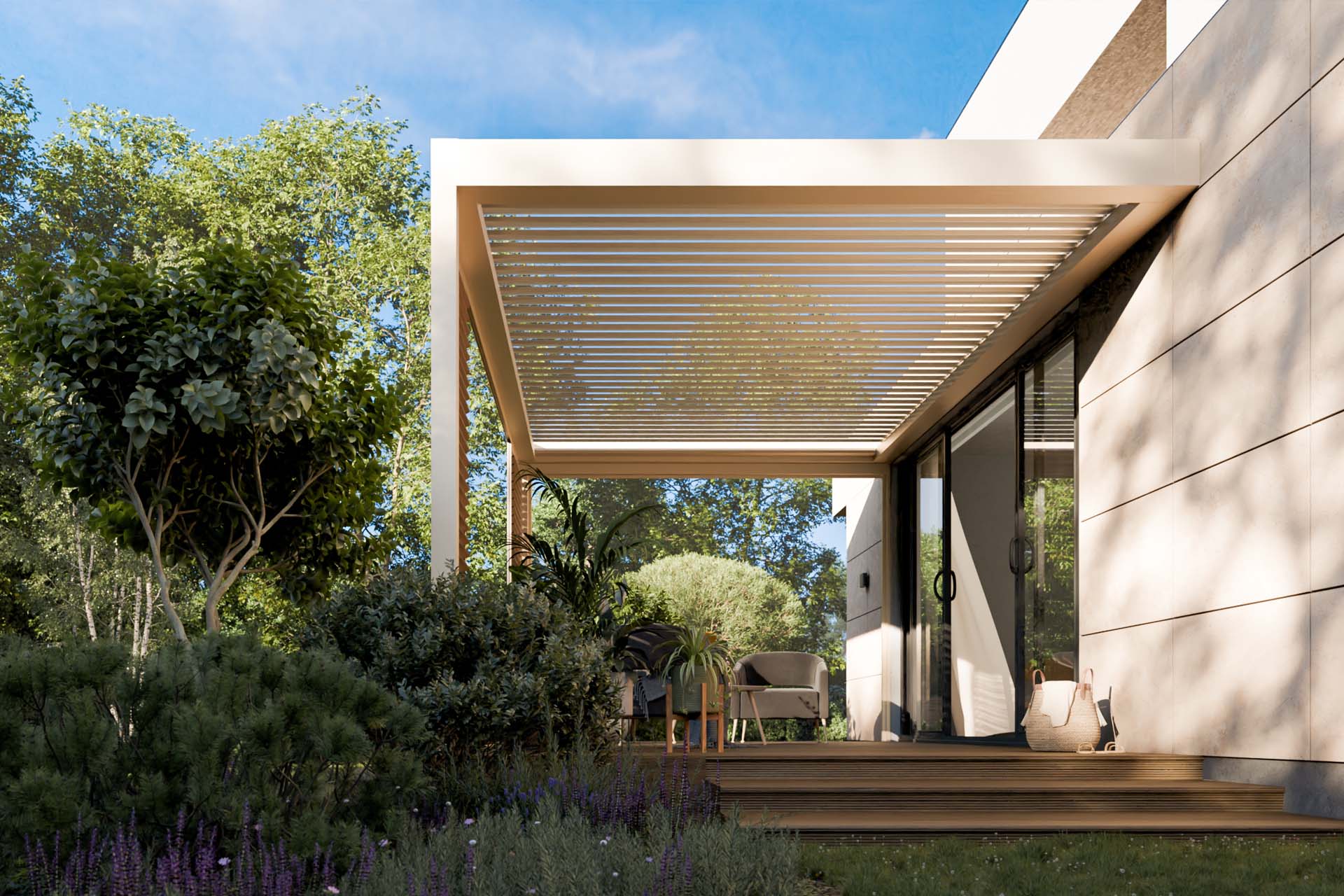 Efekt? Jeden dach i kilka opcji użytkowania: pełne zadaszenie, częściowe otwarcie, ażurowy cień albo otwarta przestrzeń.