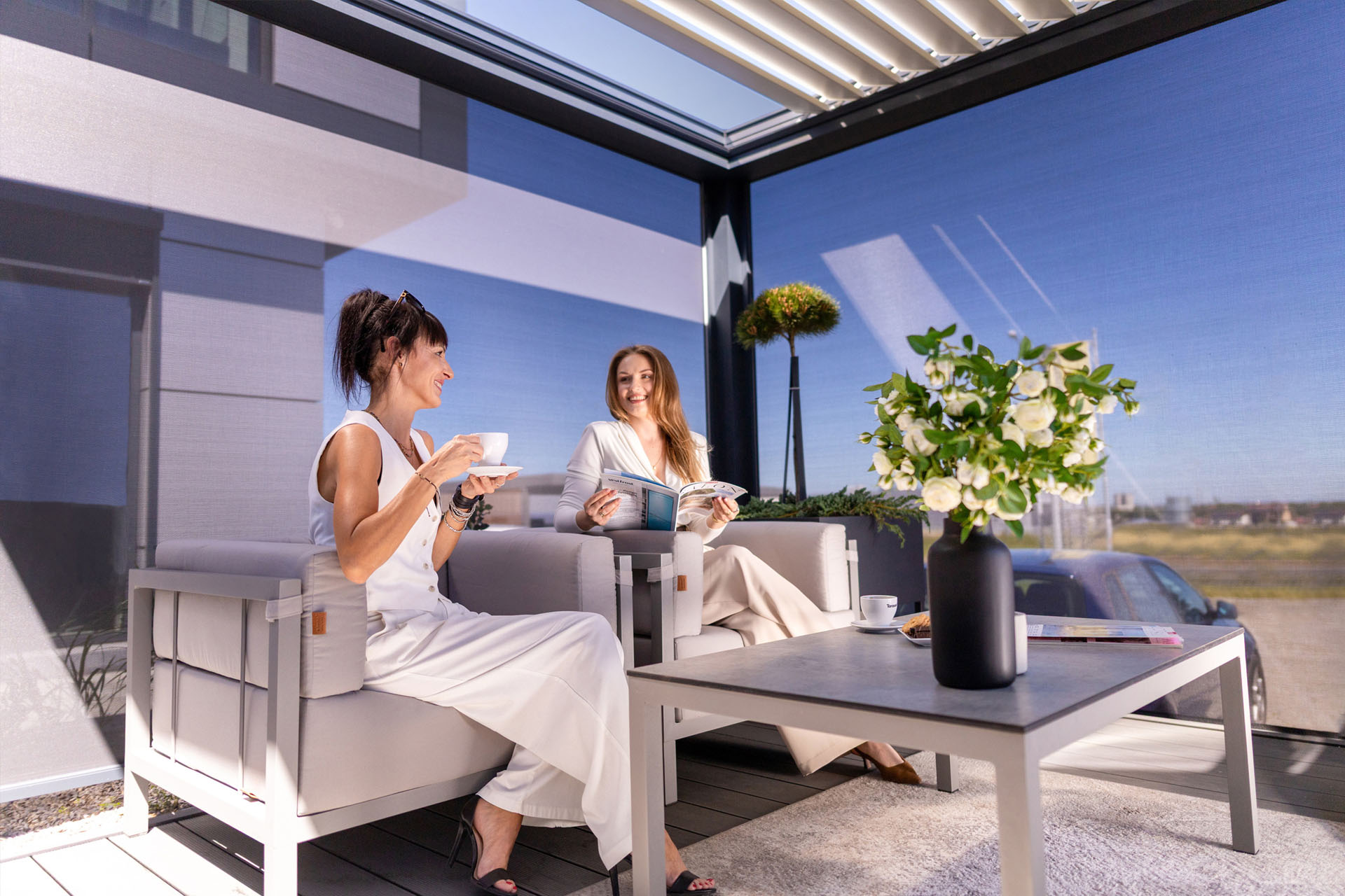 Z Technic View ten problem znika. Poza sezonem, w chłodniejsze miesiące lub po prostu wtedy, kiedy nie potrzebujesz ochrony – możesz całkowicie otworzyć dach i cieszyć się naturalnym światłem zarówno na tarasie, jak i wewnątrz domu. Wszystko odbywa się zdalnie i błyskawicznie.