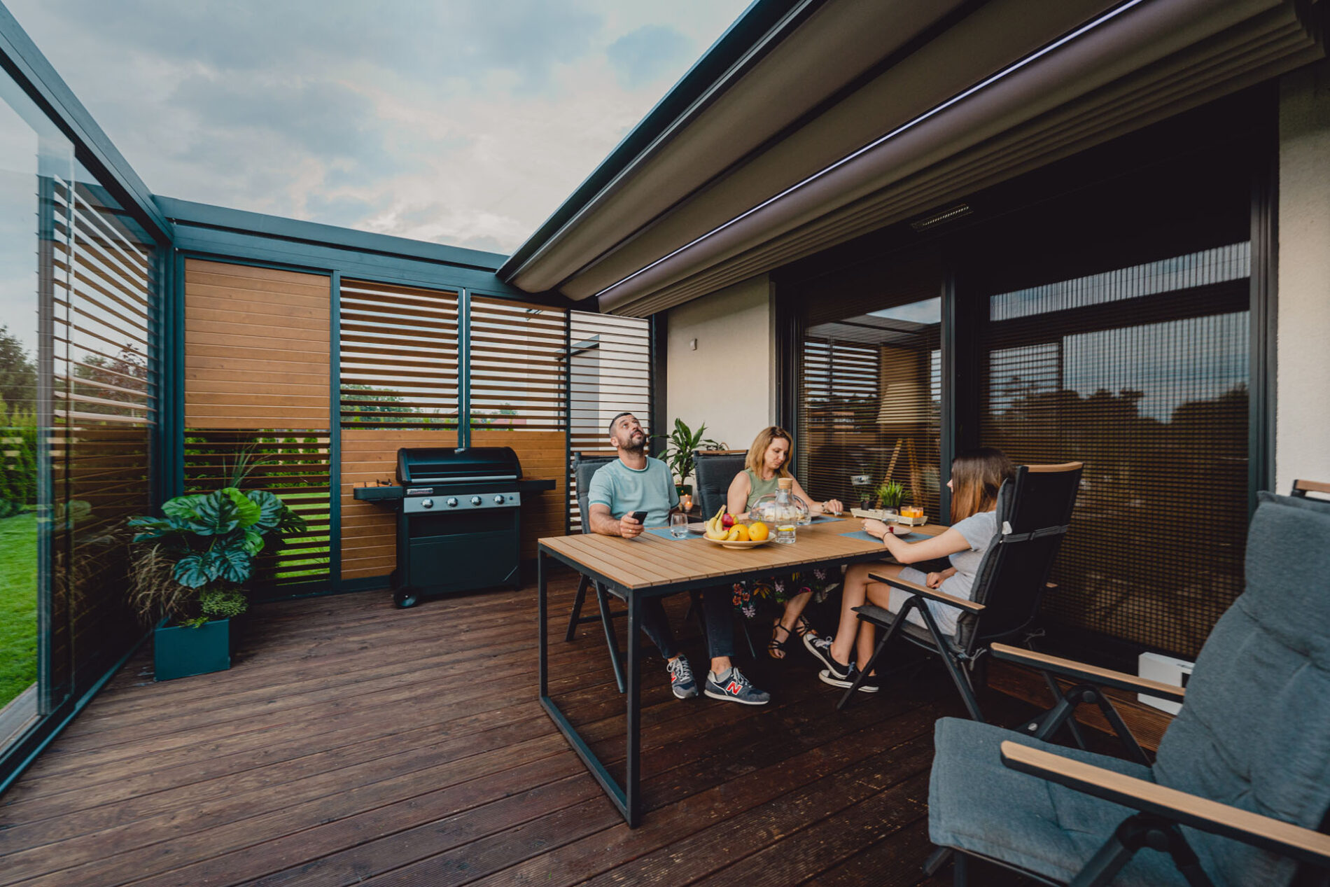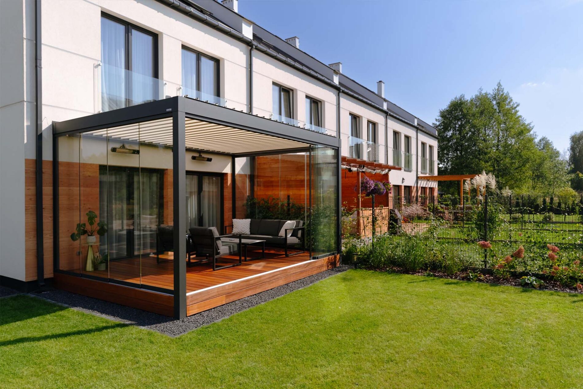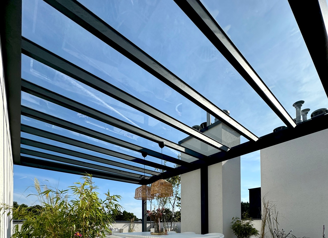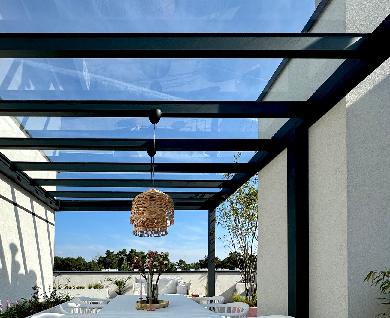 W Tarasoli szkło można zastosować w modelu Fix (zamiast poliwęglanu). Dobrze sprawdza się także w połączeniu z systemami lamelowymi, jak np. w modelu Technic New, gdzie szklany dach można zestawić z obrotowymi lamelami. To idealne rozwiązanie do strefy, którą chcesz doświetlić, np. przy wyjściu z salonu. Część lamelowa pozwala natomiast na pełną kontrolę nad światłem.