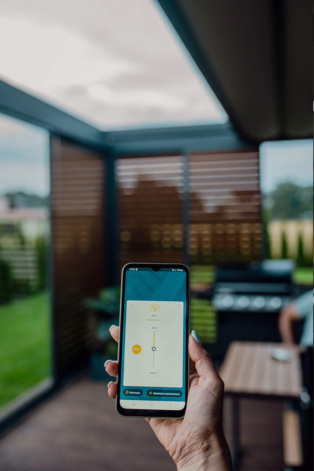 Dzięki temu możesz zarządzać tarasem z dowolnego miejsca – nawet będąc poza domem. To szczególnie ważne przy zmiennej pogodzie i kosztownym wyposażeniu przestrzeni zewnętrznej.