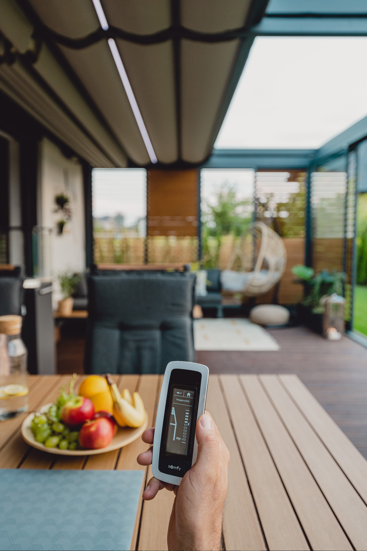 System smart home pozwala na zarządzanie zadaszeniem, osłonami czy oświetleniem z poziomu aplikacji lub scenariuszy automatycznych. System może sam reagować na deszcz, wiatr czy intensywne słońce.