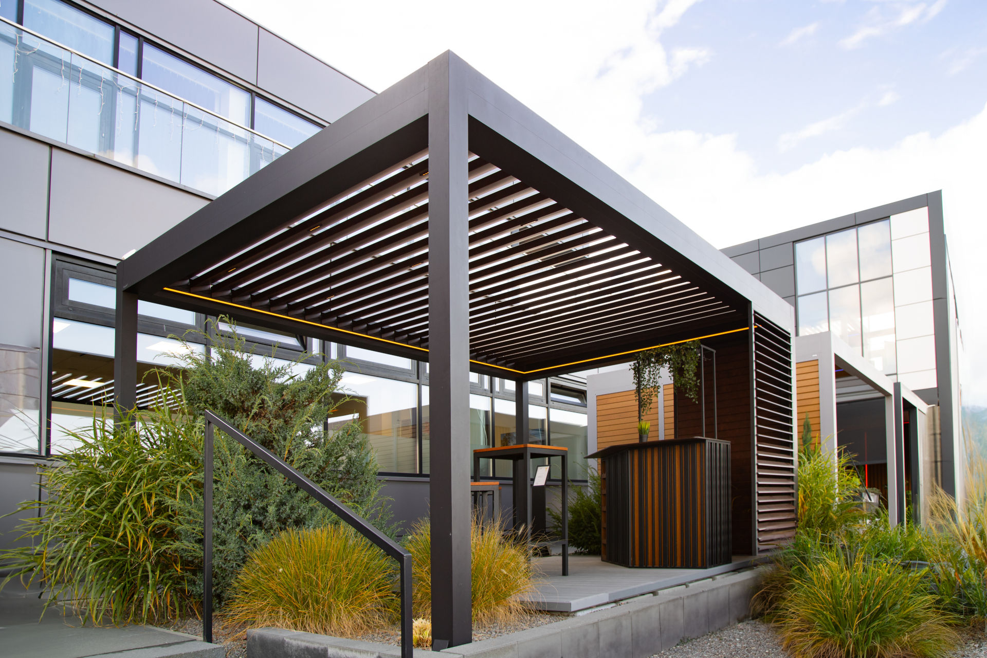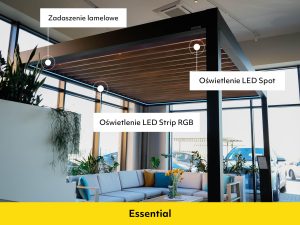 Konstrukcje wyposażone są w zabudowę boczną – shutters, rolety ZIP, przeszklenia, panel stały oraz w akcesoria: oświetlenie LED, promienniki ciepła, czujniki pogodowe.