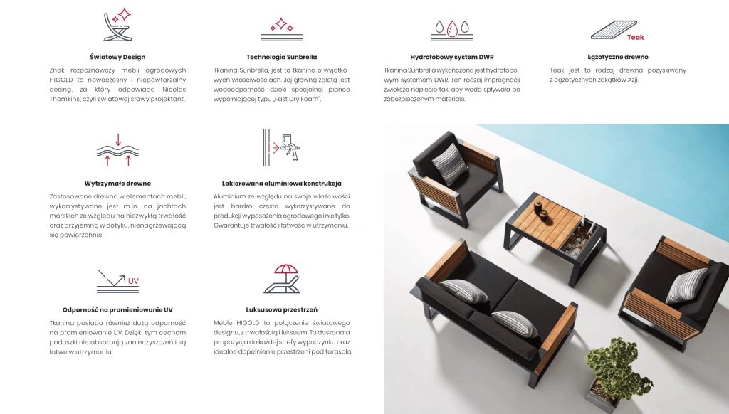 Kolekcja mebli jest wykonana z naturalnego surowego drewna tekowego i wymaga zabezpieczenia, aby zapobiegać naturalnemu procesowi jego szarzenia. Szczegółowe informacje dotyczące sugerowanych metod zabezpieczenia drewna w meblach Higold znajdują się tu: https://www.higoldeurope.eu/cleaner-kits/