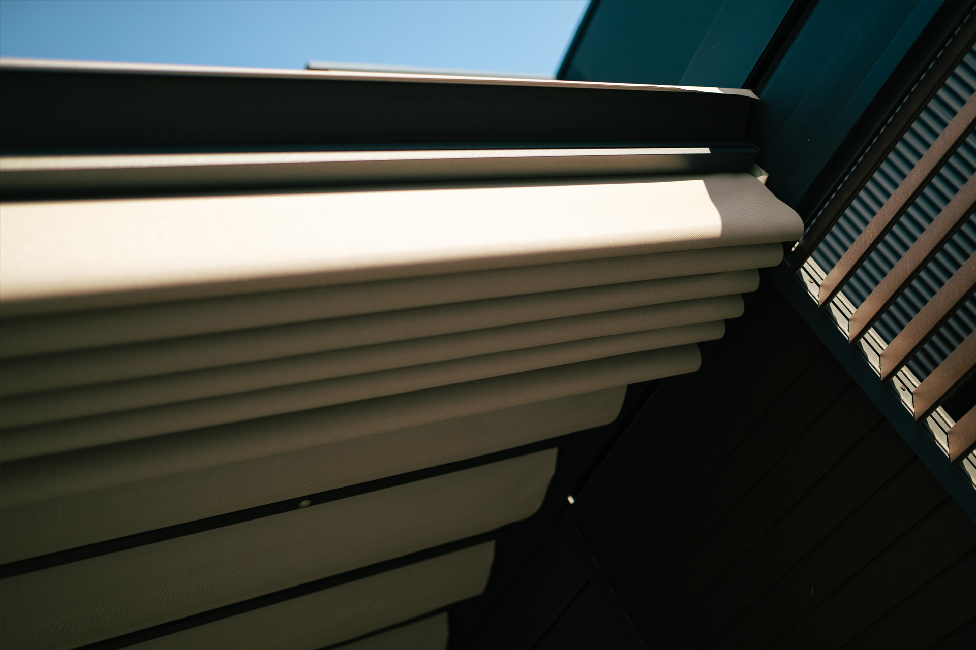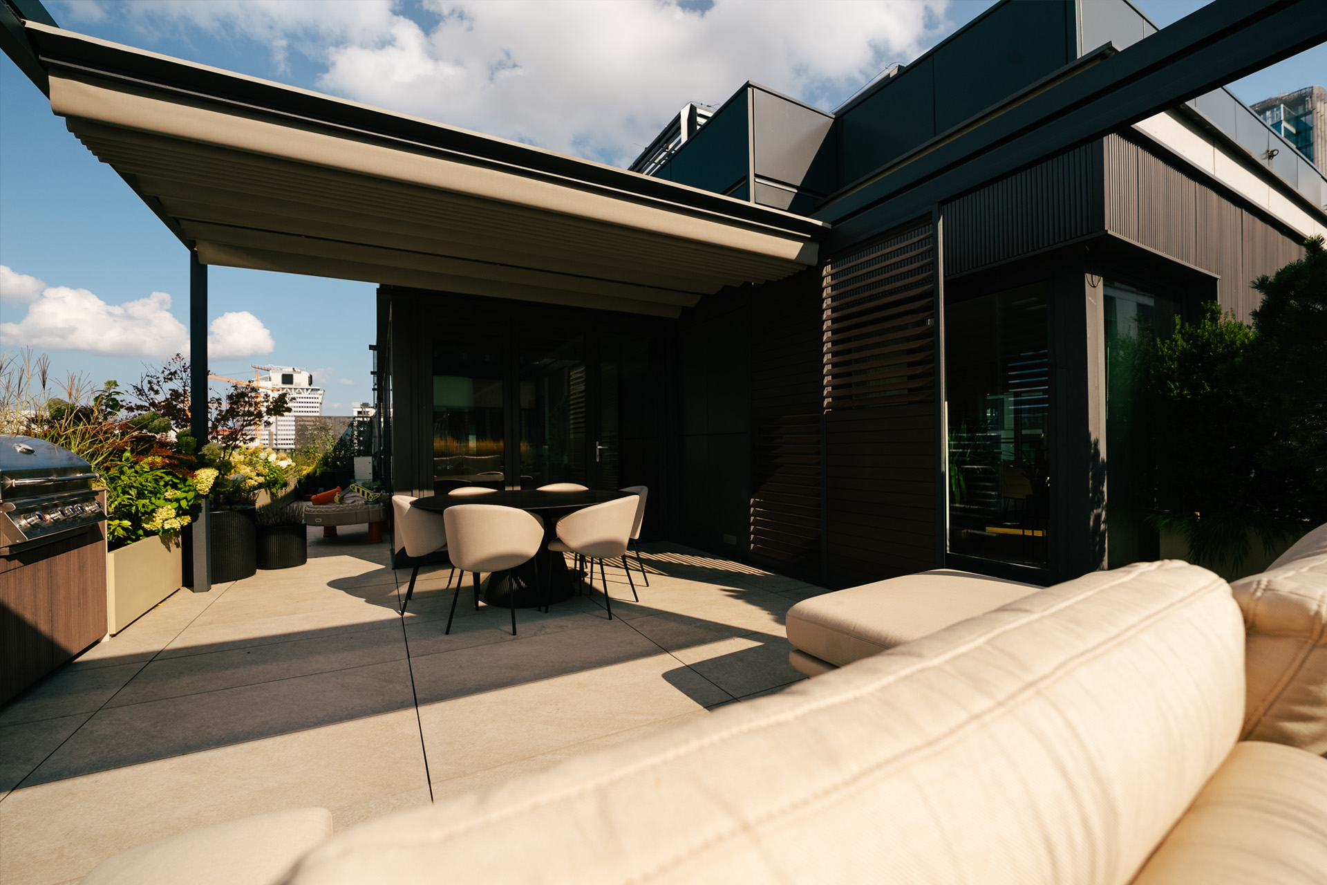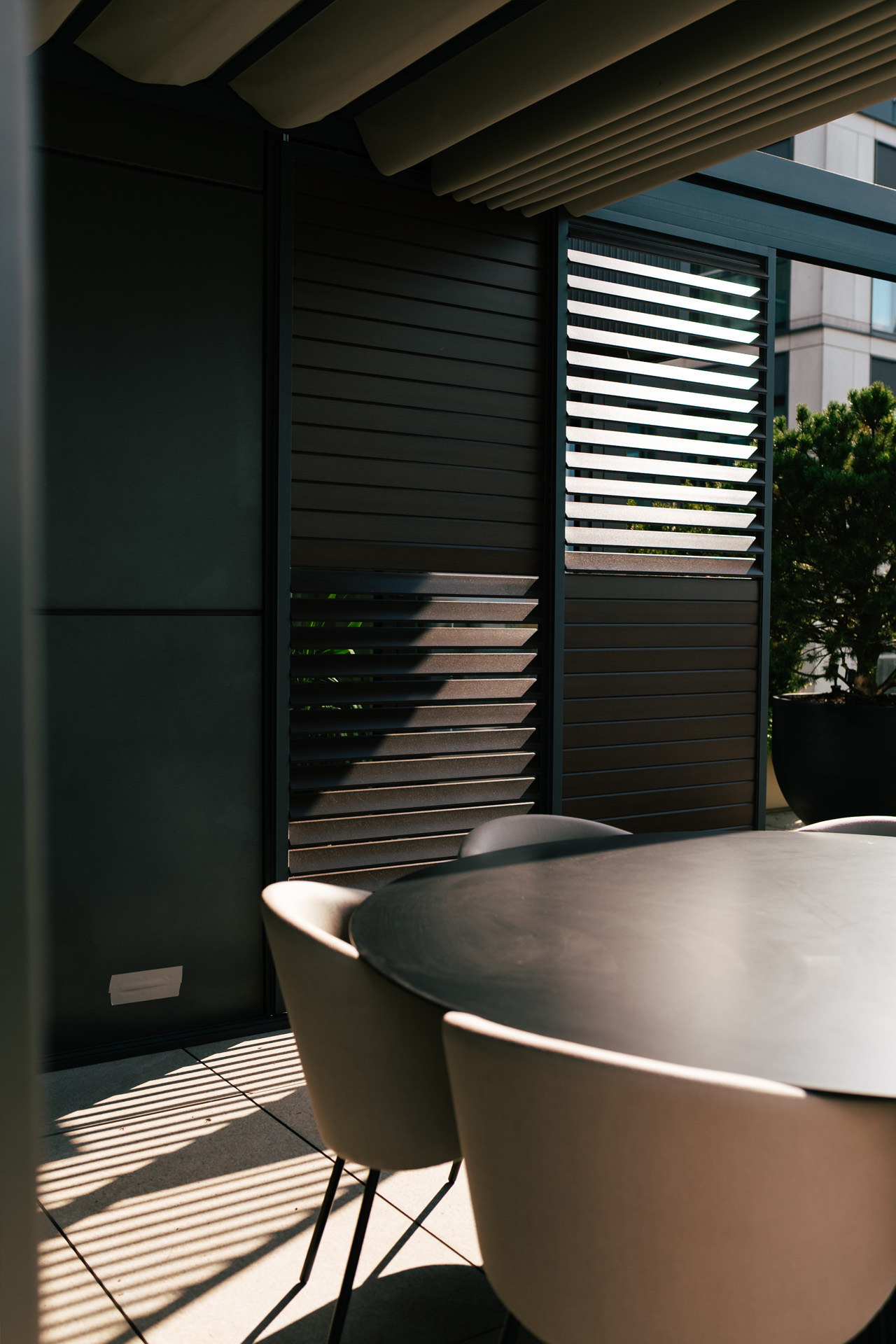 Taras na wysokim piętrze nie musi być przeszkodą w posiadaniu komfortowej przestrzeni. Materiałowe zadaszenie i boczne shuttersy chronią przed warunkami atmosferycznymi, ale nie zasłaniają widoku na stałe. Zarówno dach jak i lamele w panelach bocznych można otworzyć/uchylić i cieszyć się pięknym widokiem.