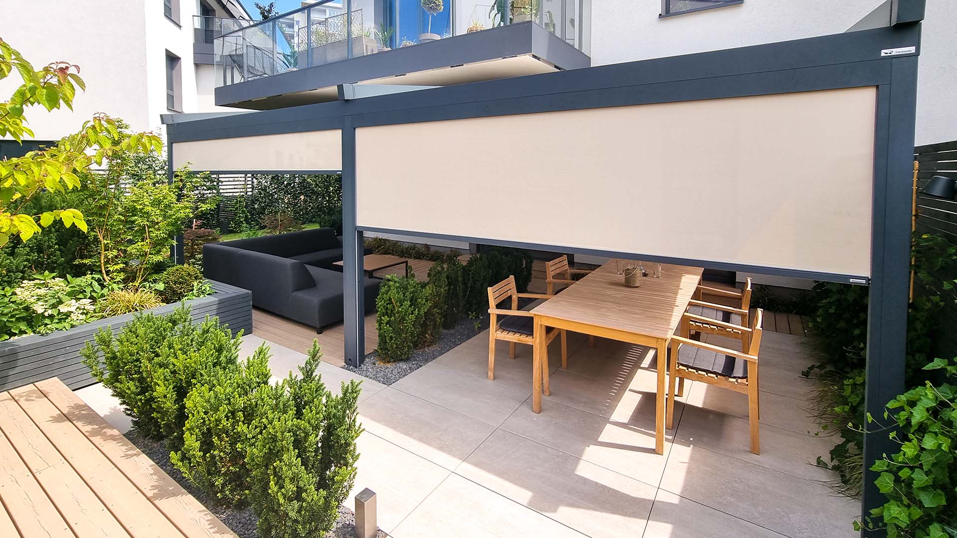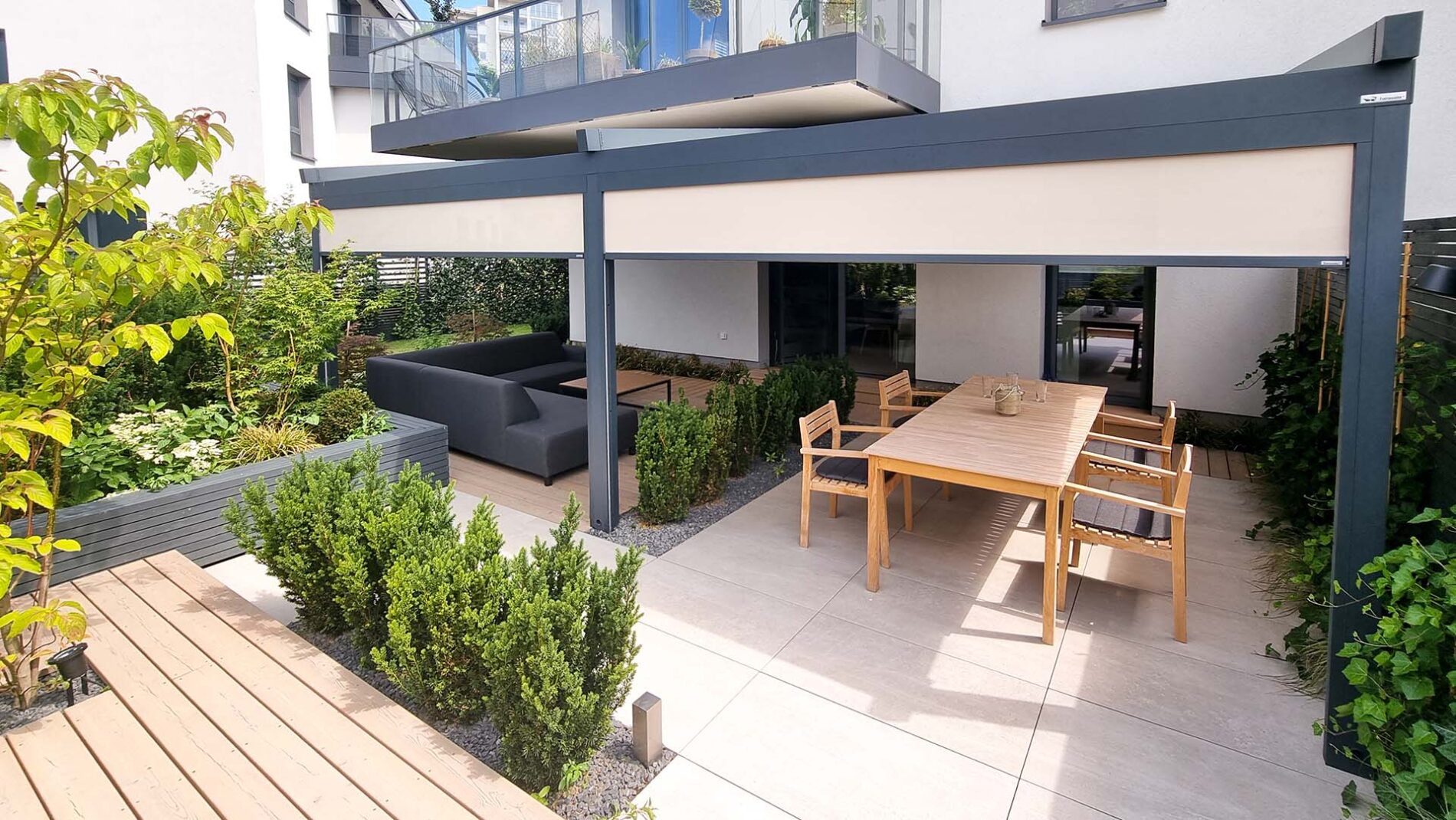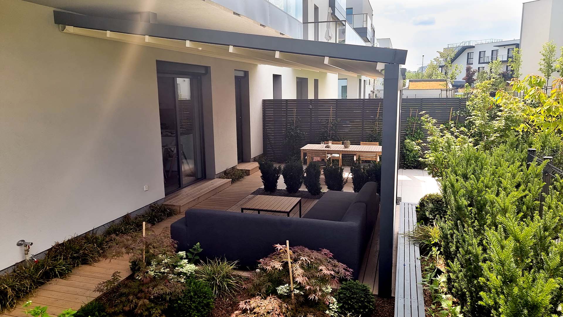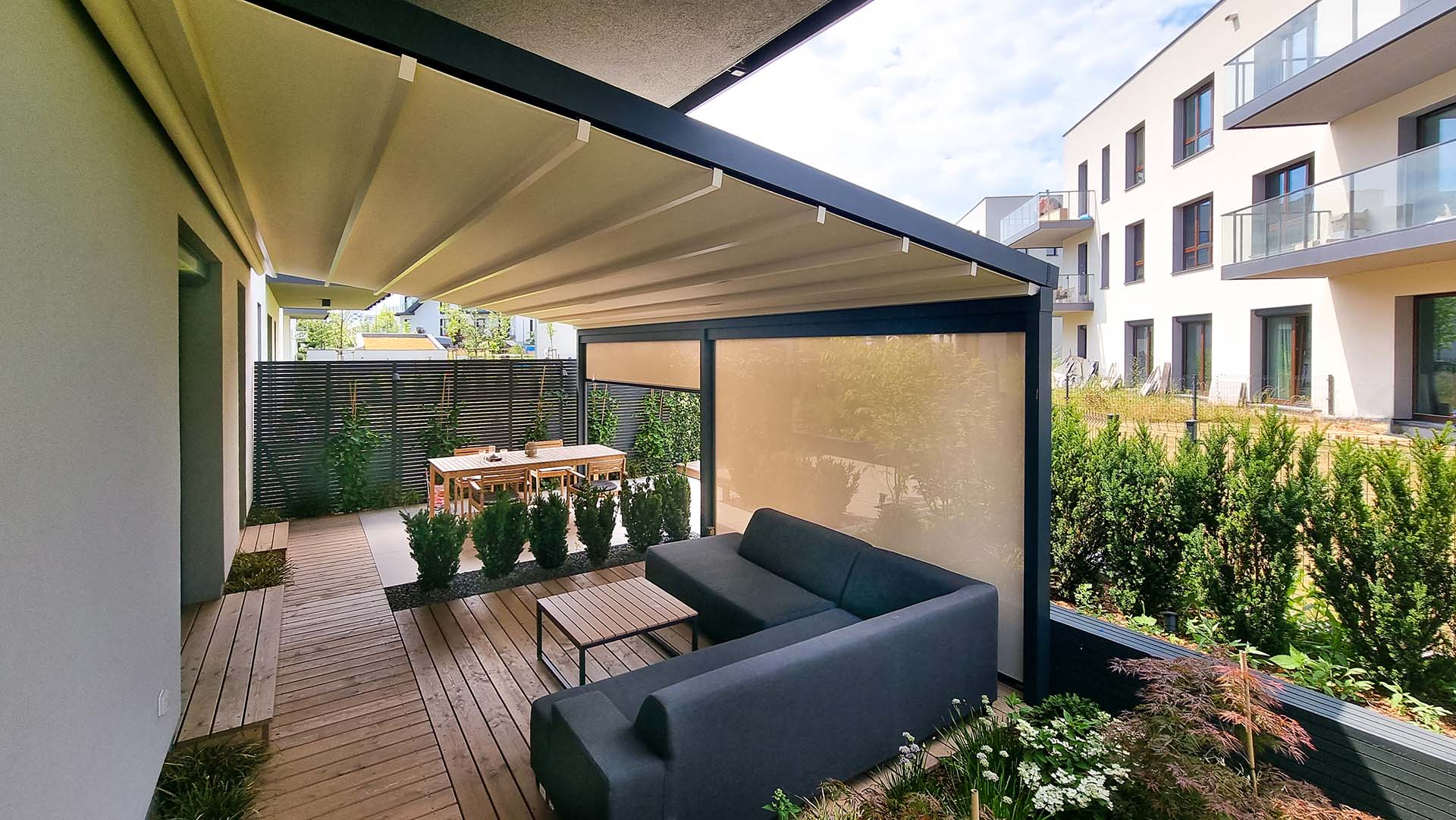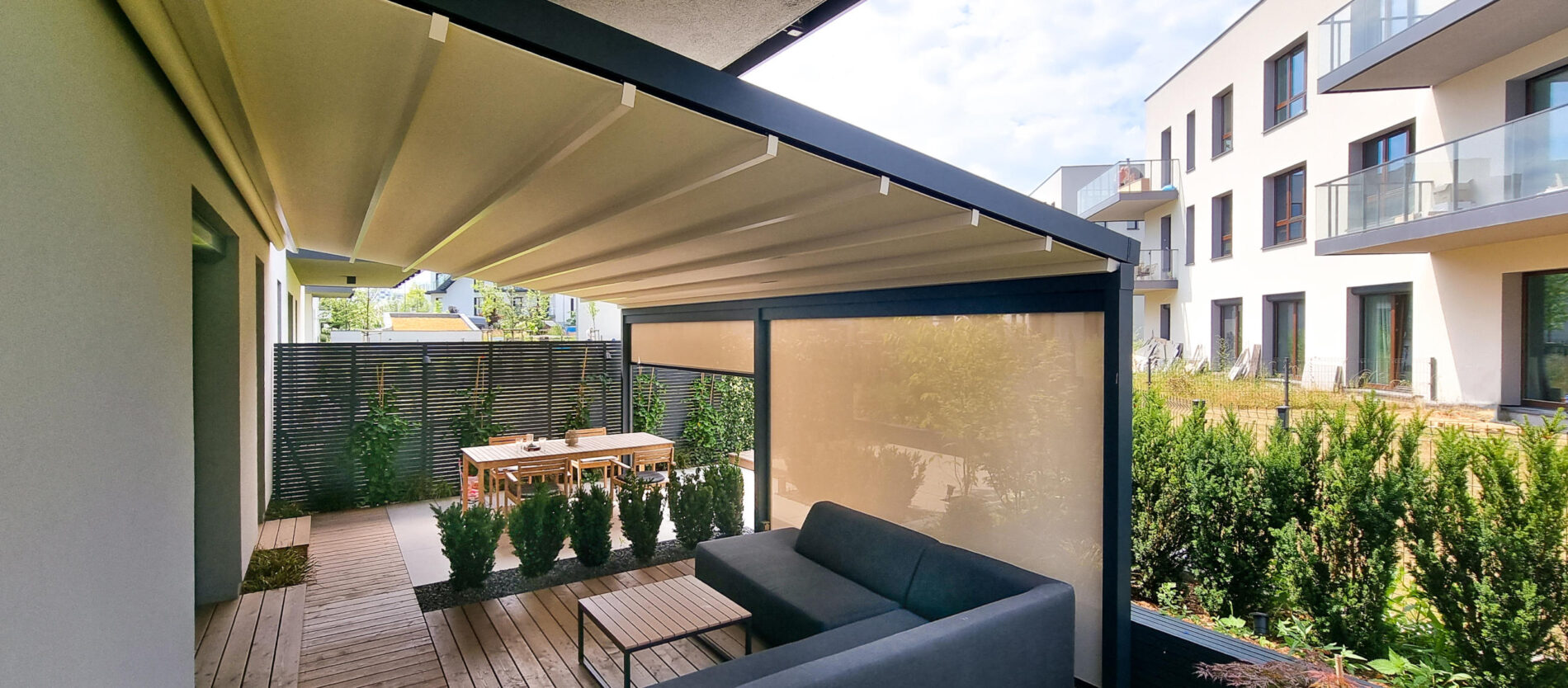 Montaż zadaszenia tarasu przy mieszkaniu na partnerze w budynku wielorodzinnym. Maksymalne wykorzystanie niedużej przestrzeni. Tarasola chroni przed warunkami atmosferycznymi, ale również daje poczucie prywatności.