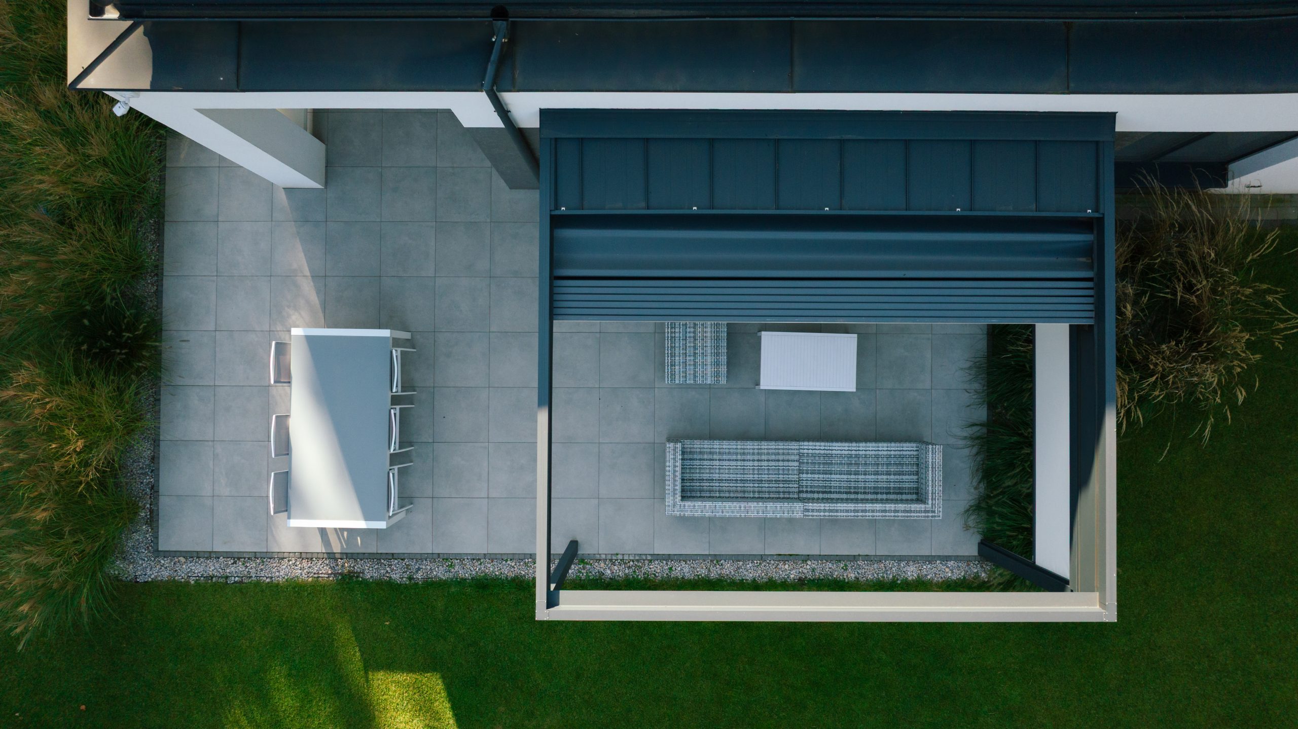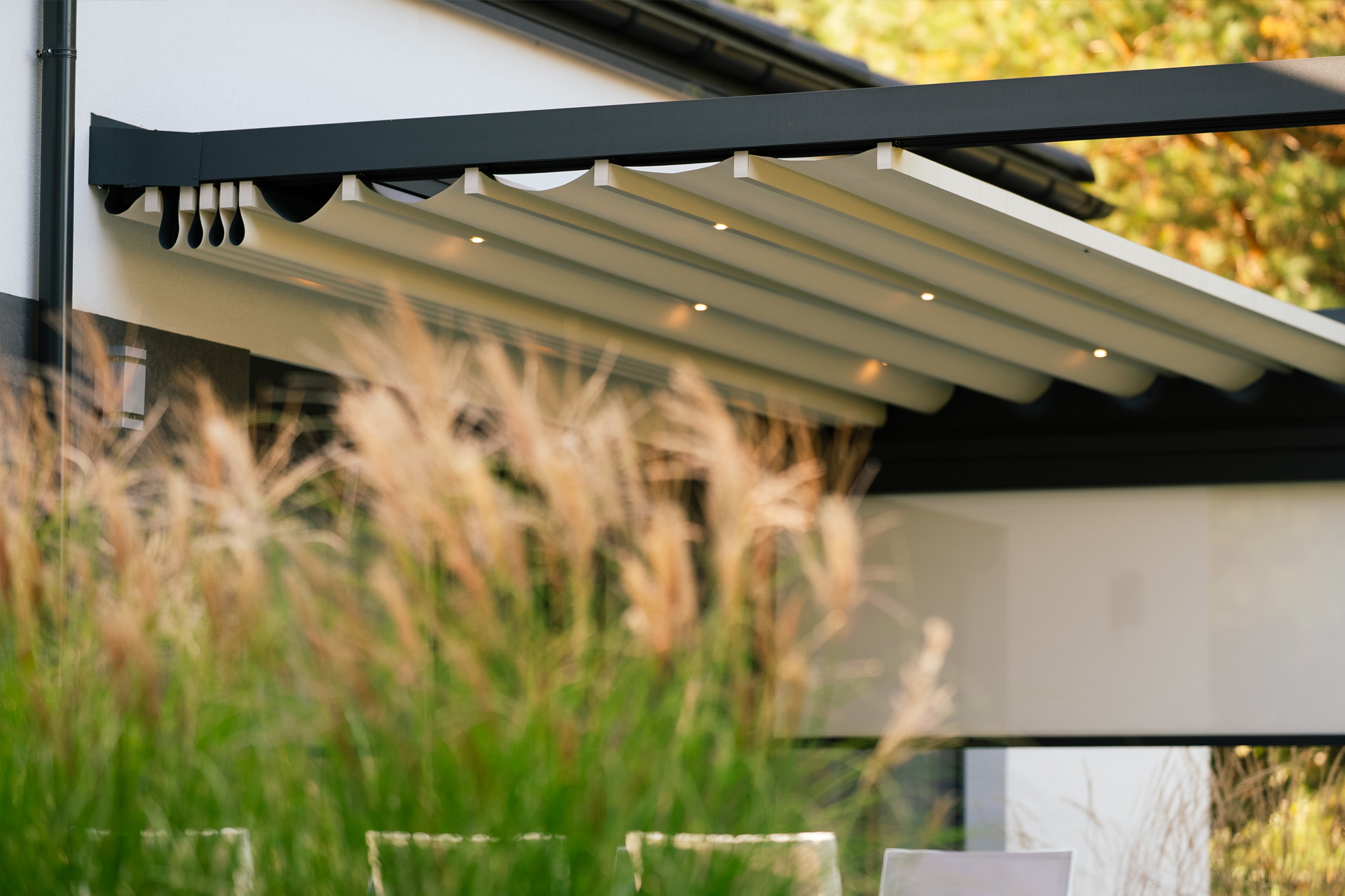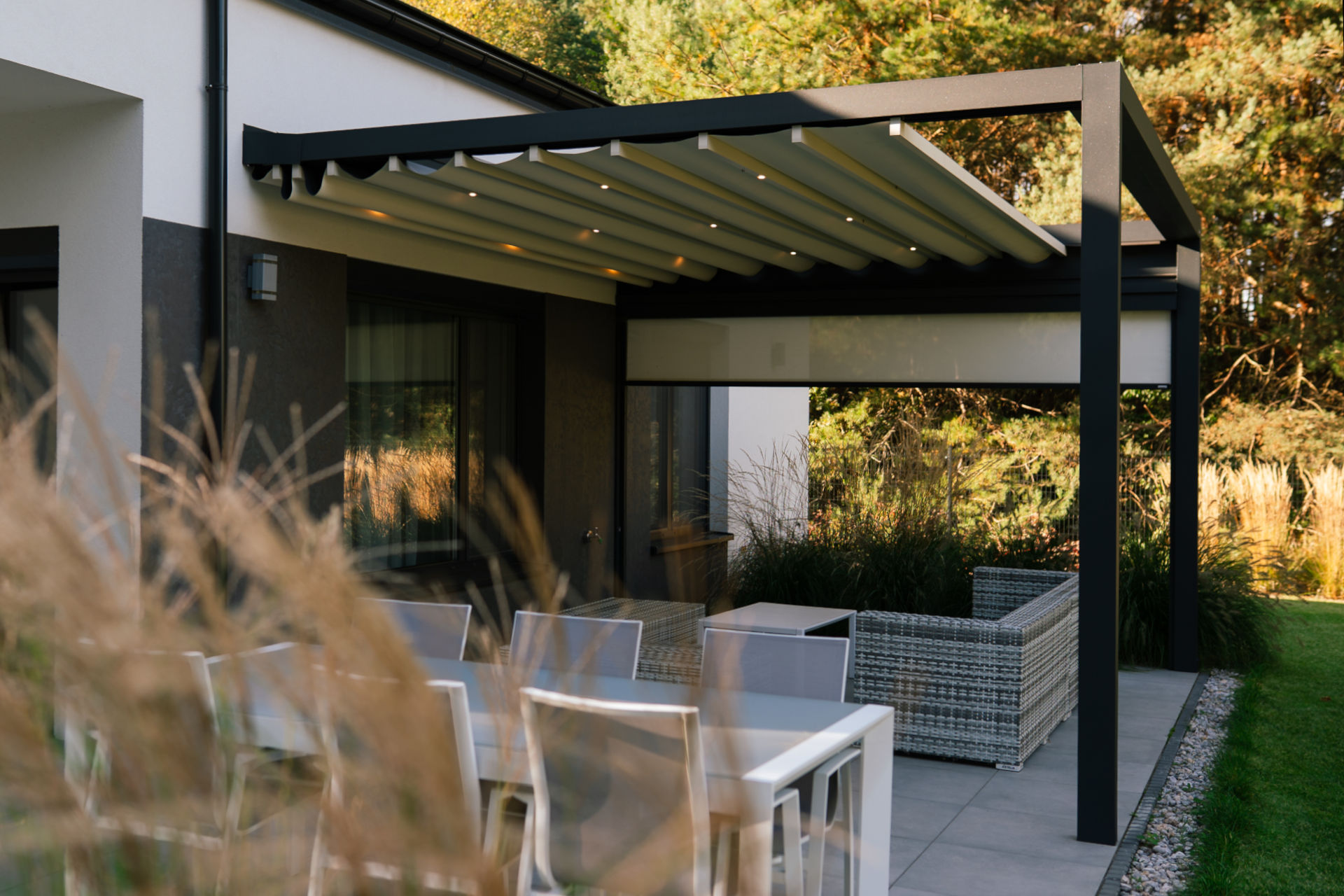 Roleta boczna chroni przed nadmiernym nasłonecznieniem, a oświetlenie LED pozwala cieszyć się tarasem również po zmroku.