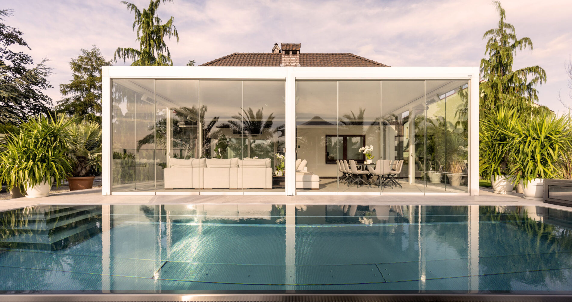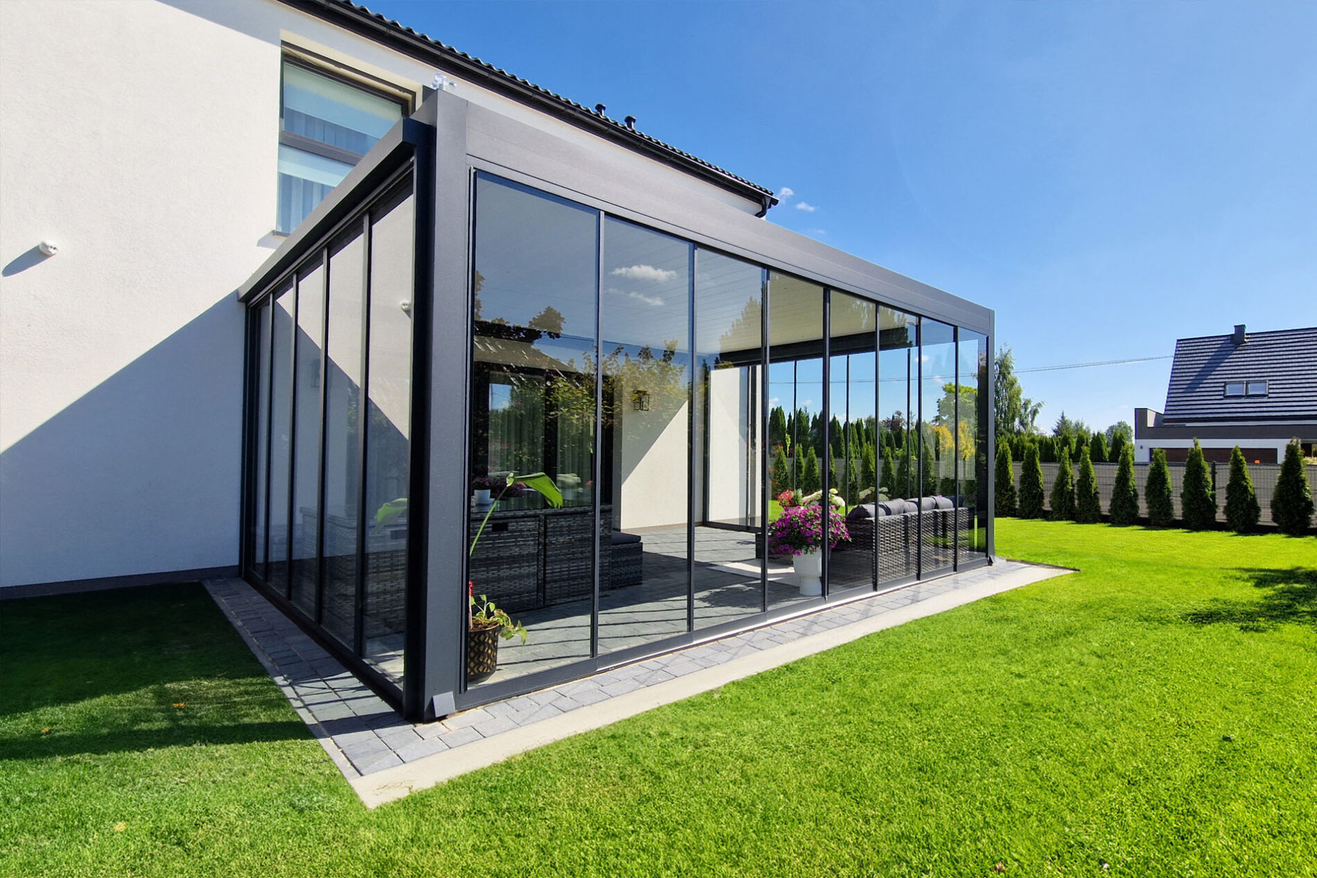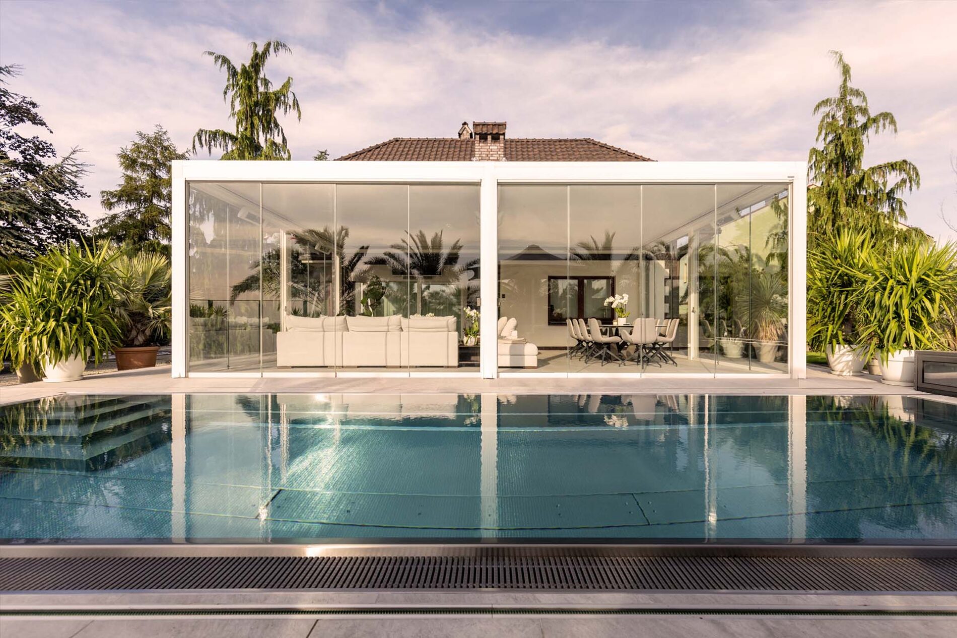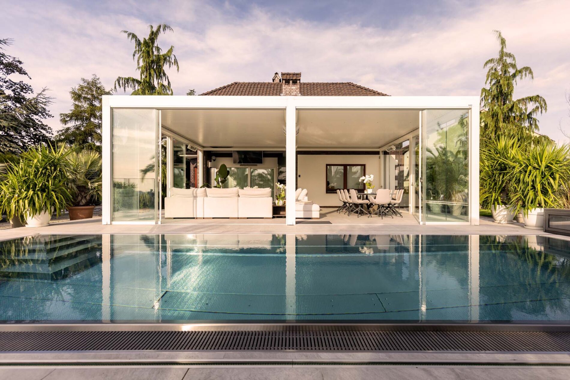 System szklanych paneli przesuwnych łączy funkcjonalność i elegancki design. Szklana ściana to bliskość natury przy jednoczesnym zachowaniu dystansu. Łatwy do zainstalowania i oferujący wiele korzyści system pasuje do każdego kontekstu architektonicznego i może być instalowany w różnego rodzaju przestrzeniach, takich jak tarasy, ogrody lub nawet balkony.