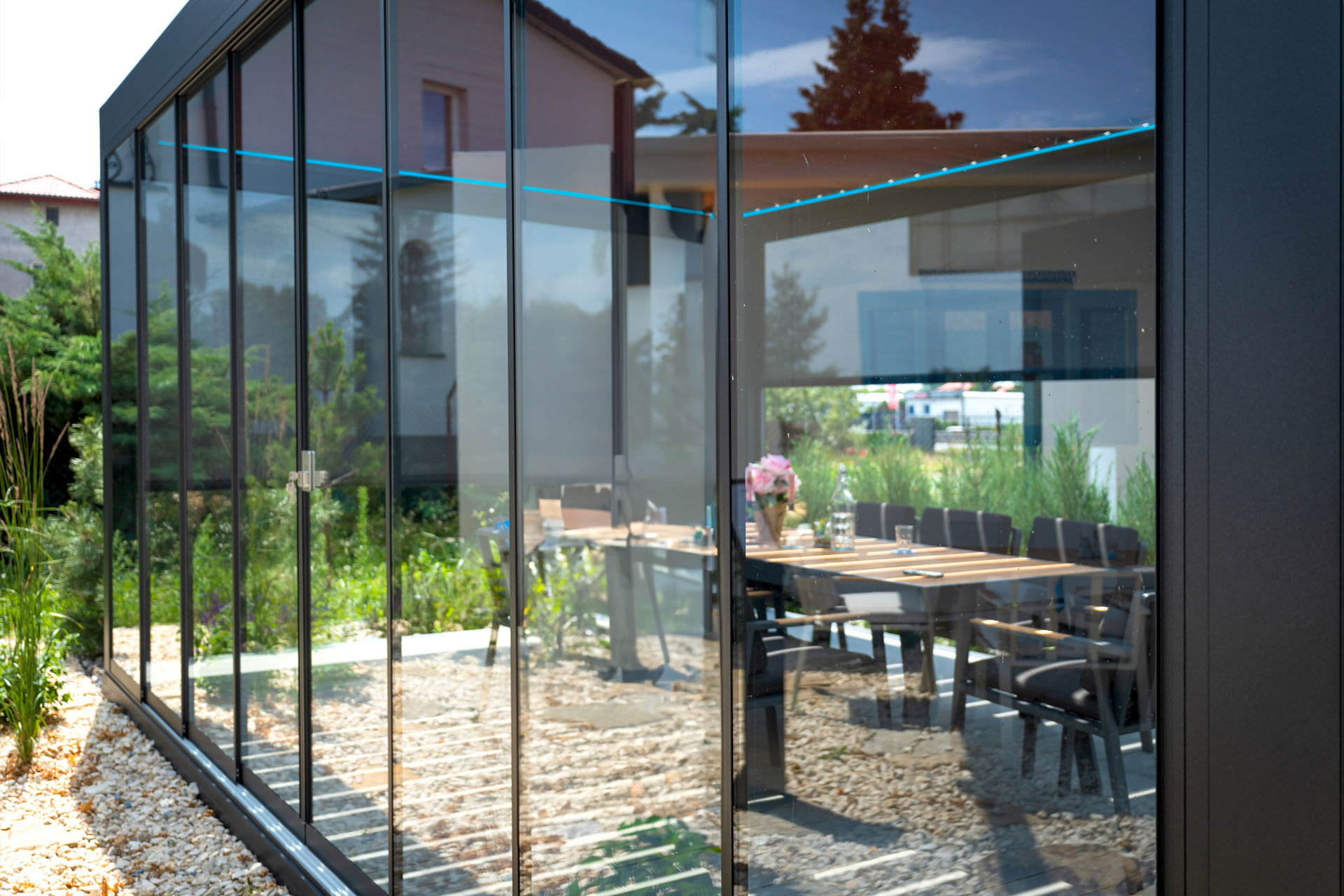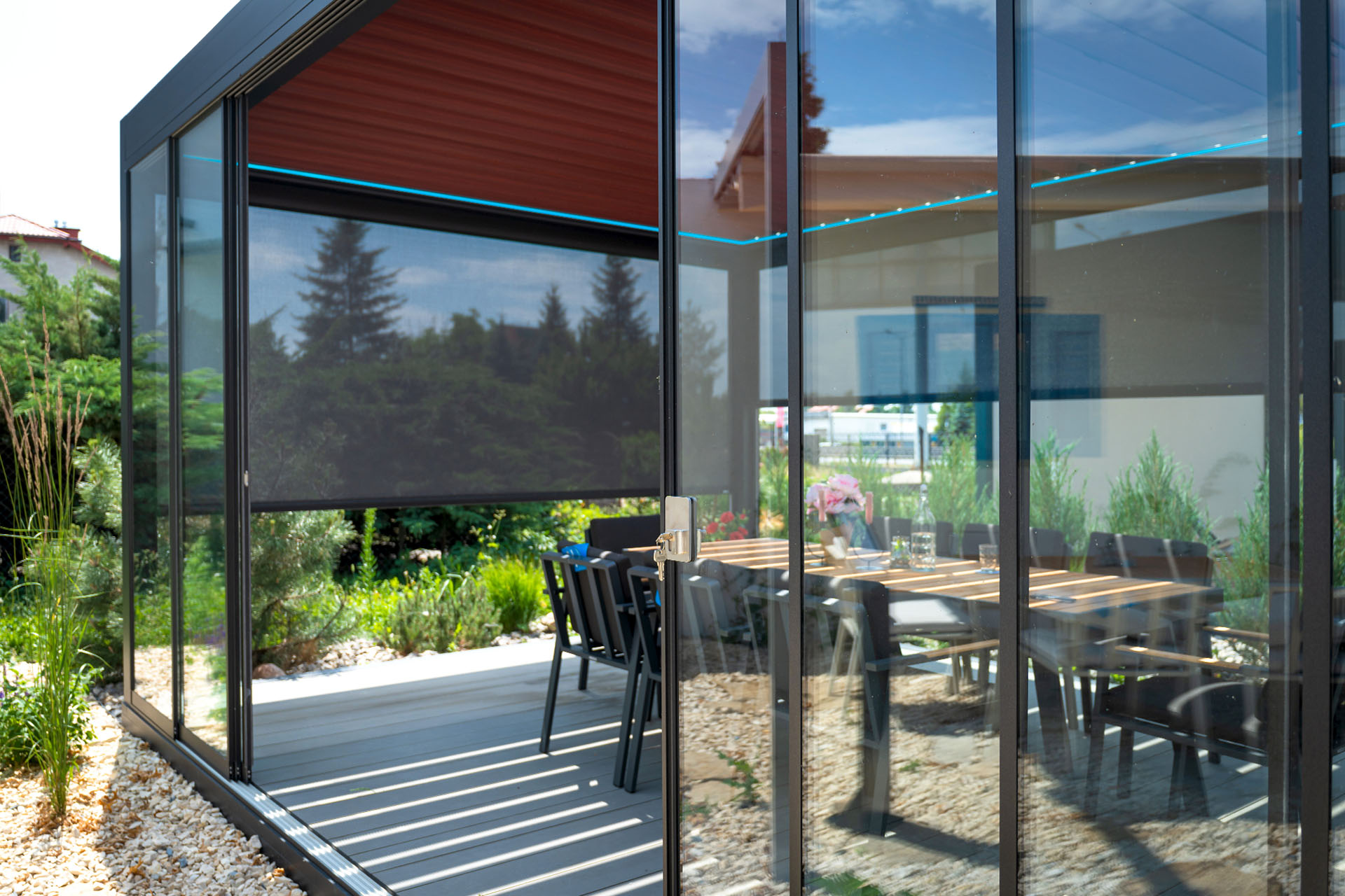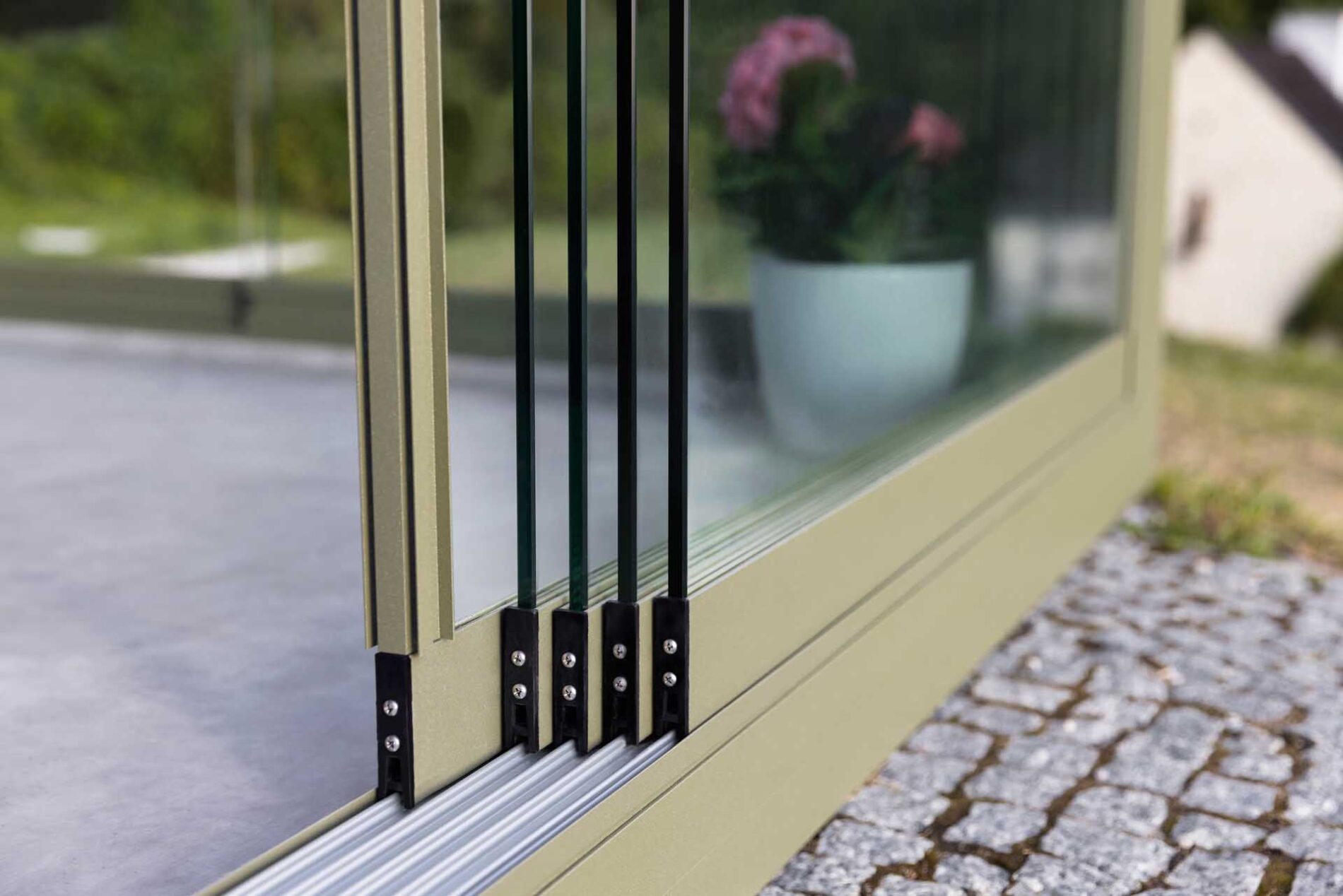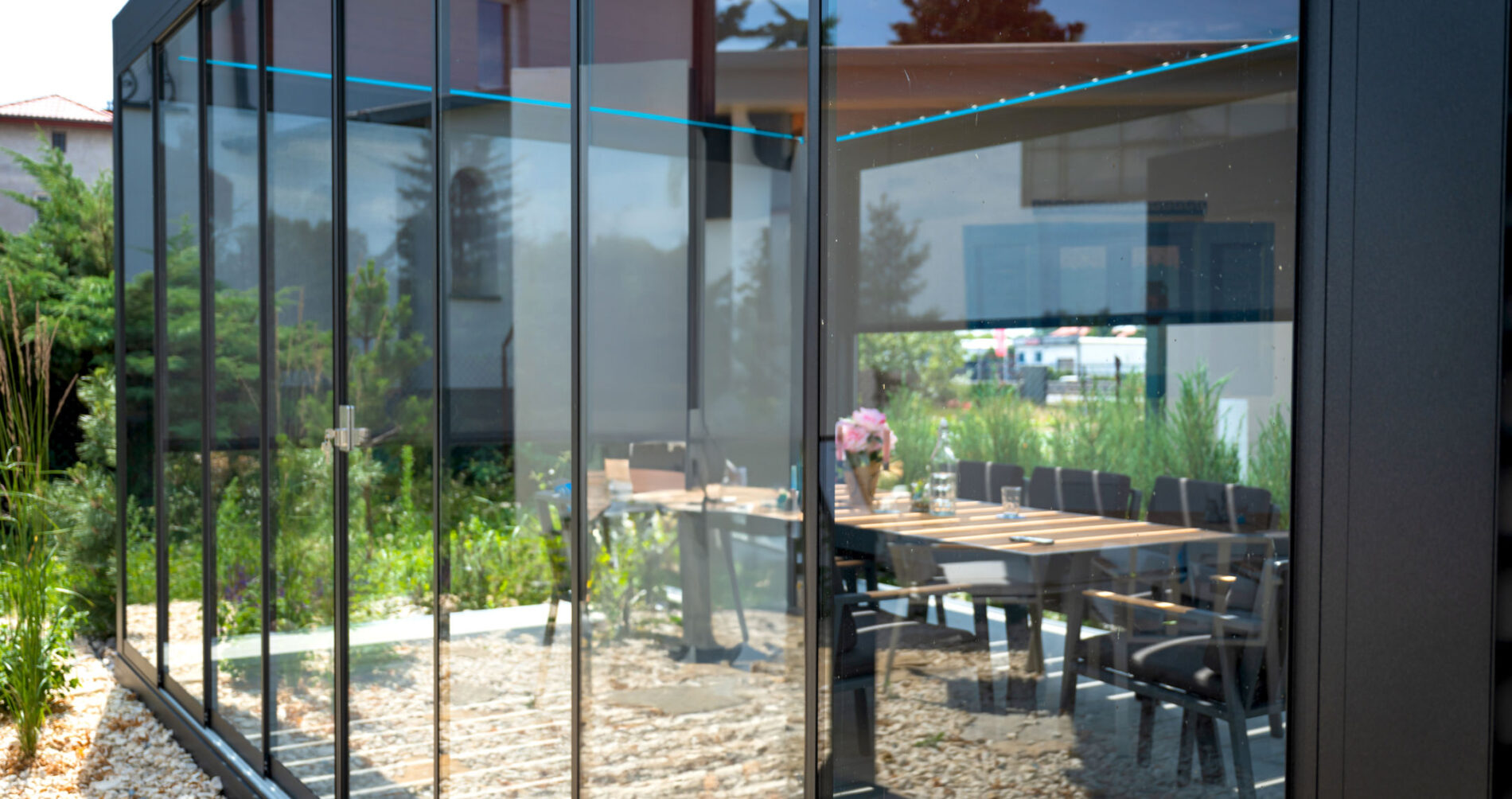 Bezramowe drzwi przesuwno-składane po zamknięciu są niemal niewidoczne. Bezpieczne szkło hartowane o grubości 8, 10 lub 12 mm jest bezpieczne w użytkowaniu. Dodatkową opcją jest profil dolny chowany w podłożu. Zabudowy przedłużają sezon od wczesnej wiosny do późnej jesieni. To idealne rozwiązanie na przeszklenia.