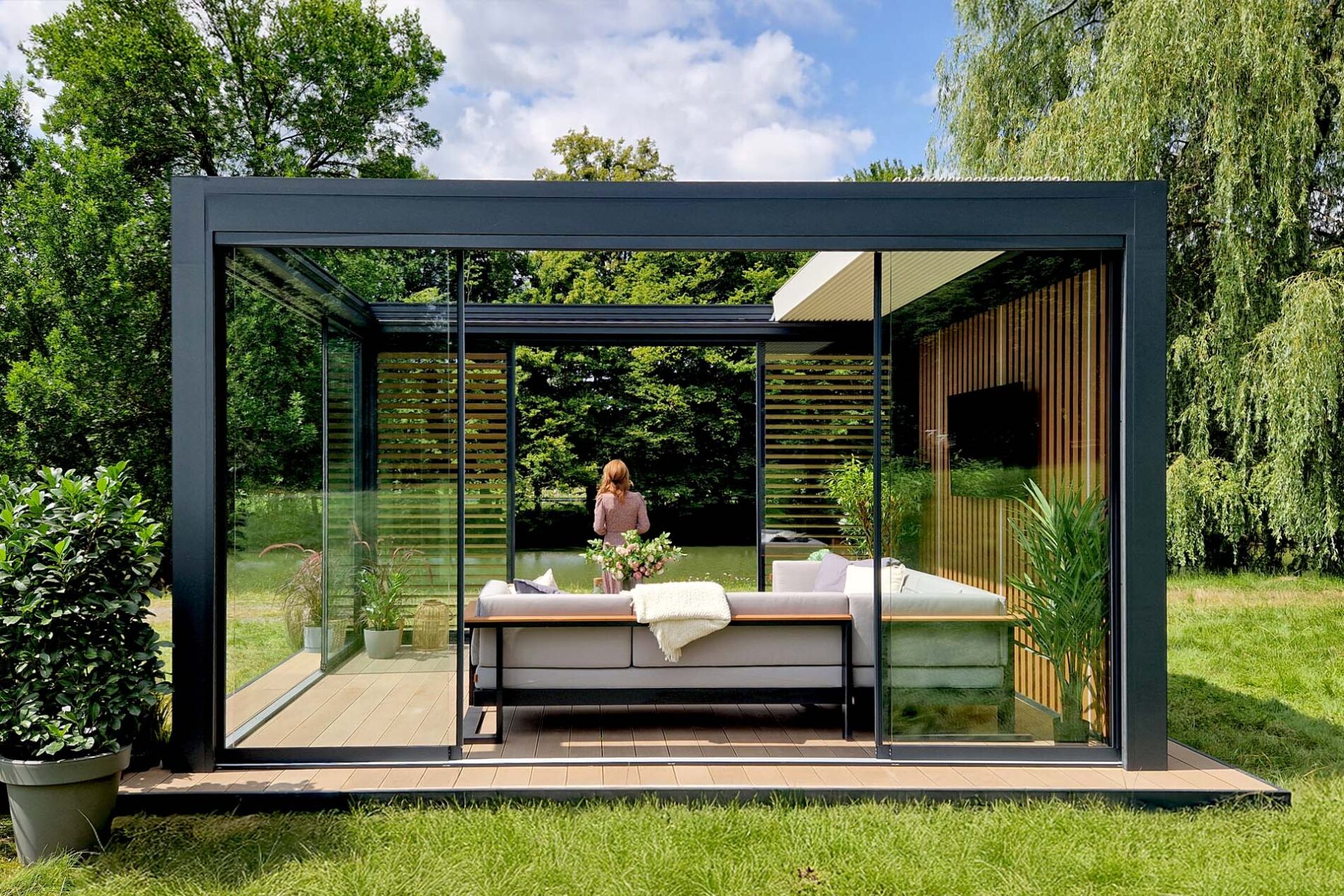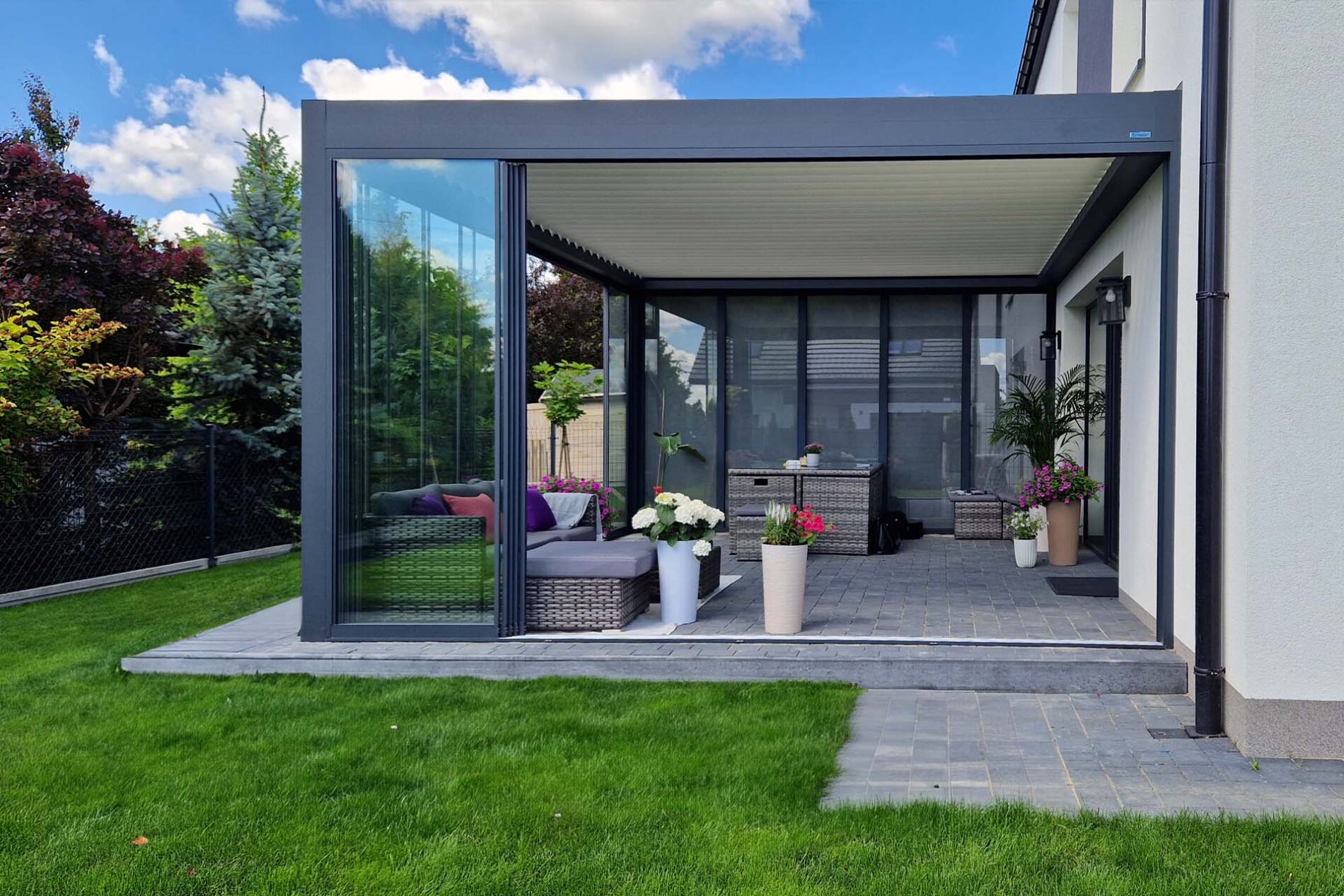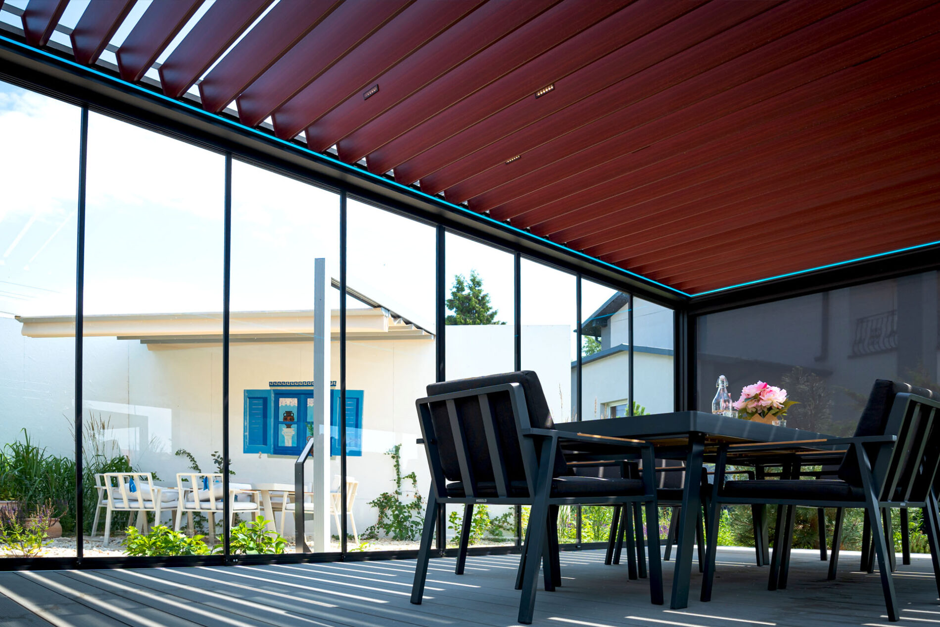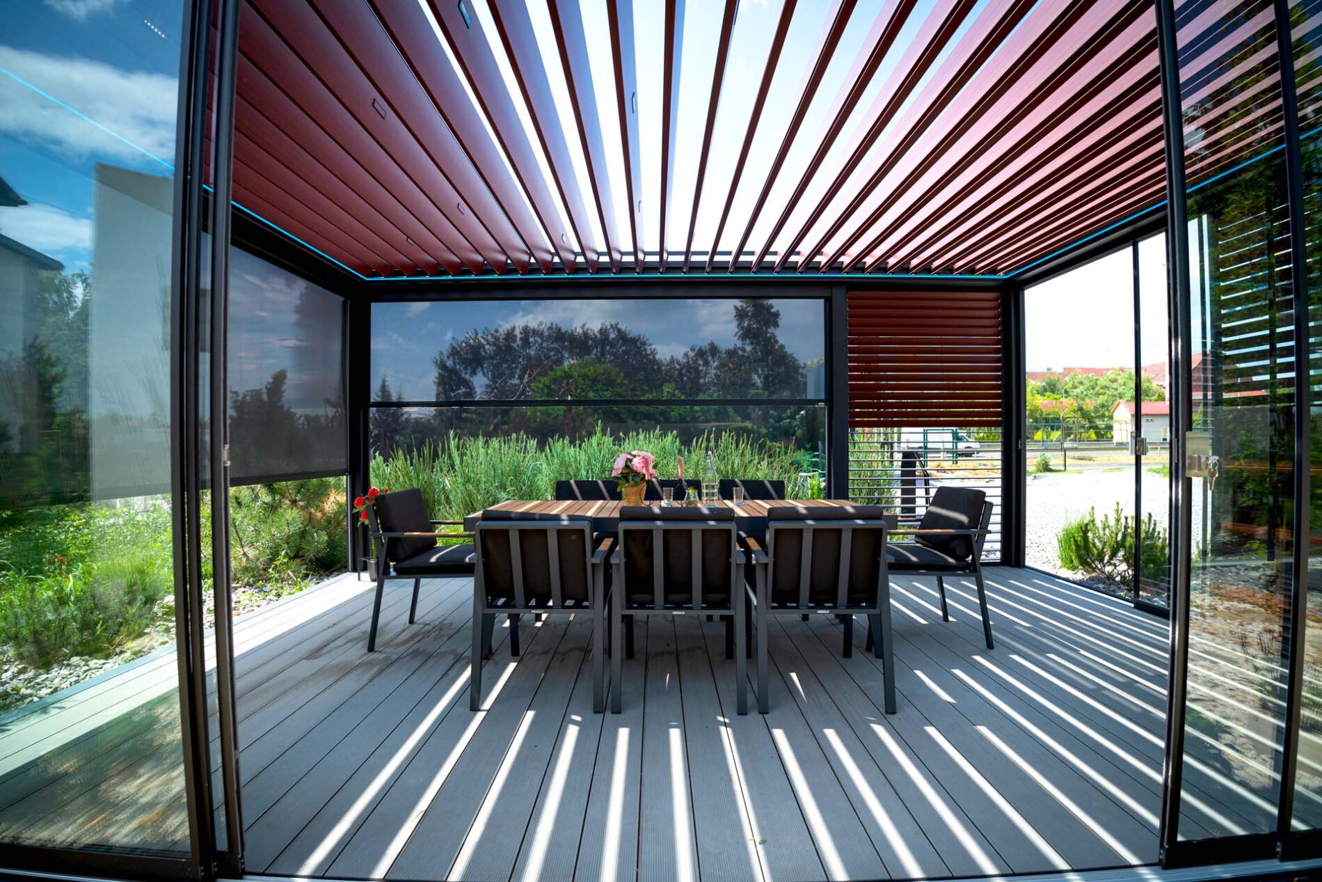 Bezramowe drzwi przesuwno-składane po zamknięciu są niemal niewidoczne. Bezpieczne szkło hartowane o grubości 8, 10 lub 12 mm jest bezpieczne w użytkowaniu. Dodatkową opcją jest profil dolny chowany w podłożu. Zabudowy przedłużają sezon od wczesnej wiosny do późnej jesieni. To idealne rozwiązanie na przeszklenia.