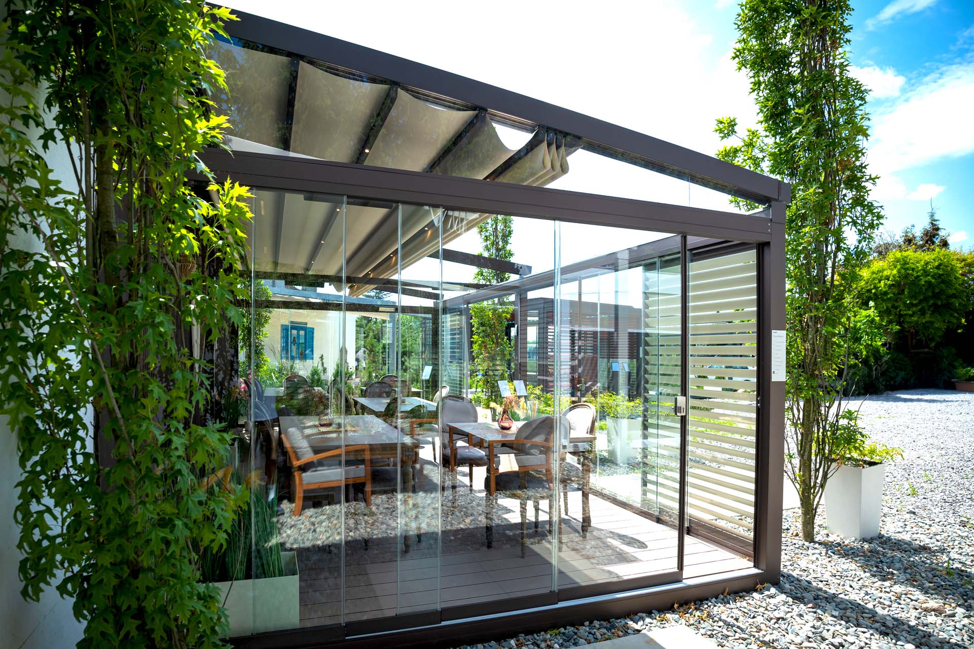 Ideę tego rozwiązania stanowią panele przesuwane w poziomie, poruszające się za pomocą wózków jezdnych na profilu aluminiowym cztero- albo pięciotorowym. Panele stanowią ochronę przed niekorzystnymi warunkami atmosferycznymi: wiatrem, deszczem, śniegiem oraz zabrudzeniem i hałasem, nie ograniczając jednocześnie widoczności. Bezramowe panele przesuwne po zamknięciu są niemal niewidoczne.