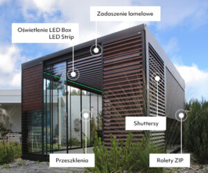 Konstrukcje wyposażone są w zabudowę boczną – shutters, rolety ZIP, przeszklenia, panel stały oraz w akcesoria: oświetlenie LED, promienniki ciepła, czujniki pogodowe.