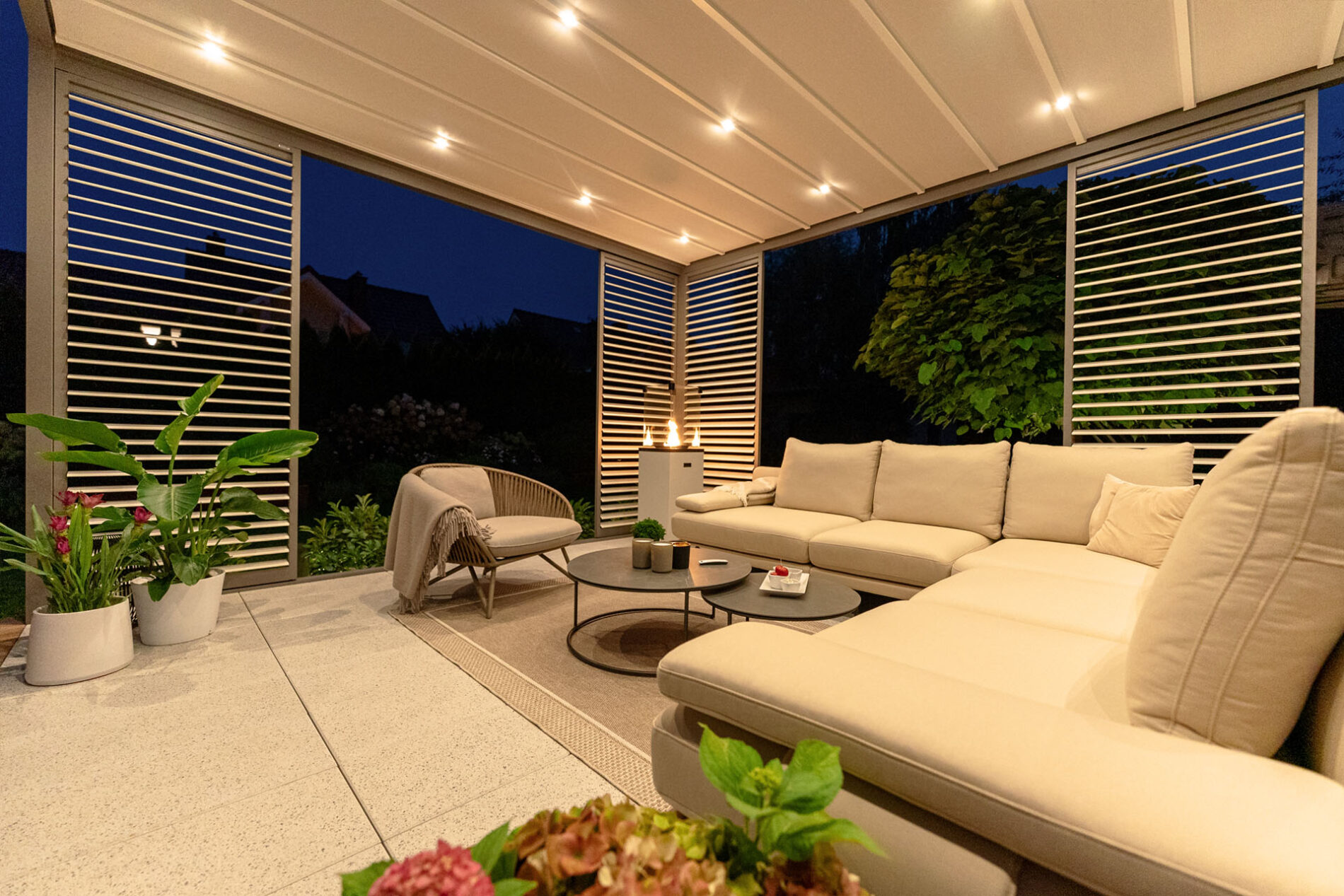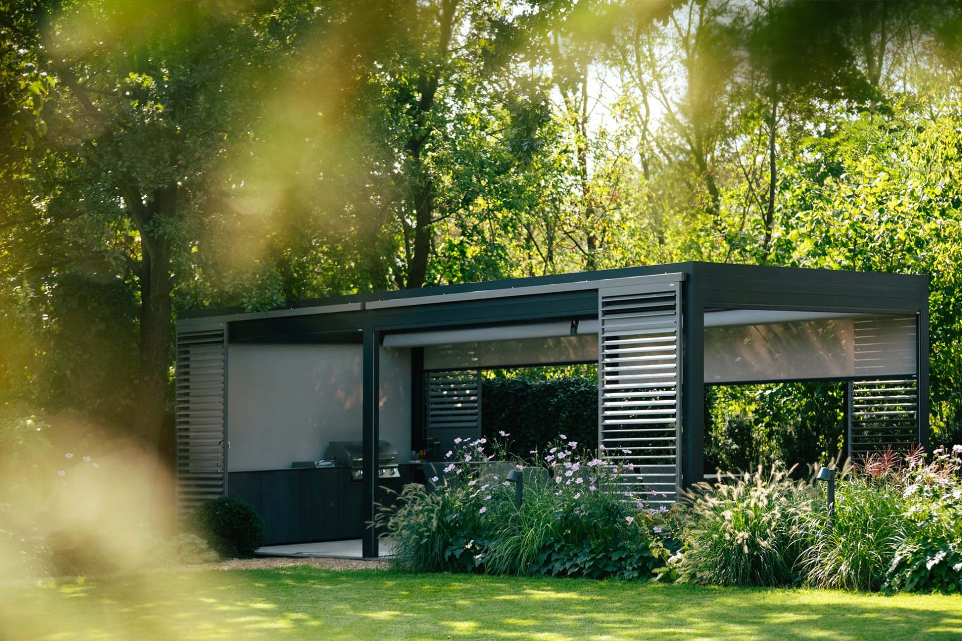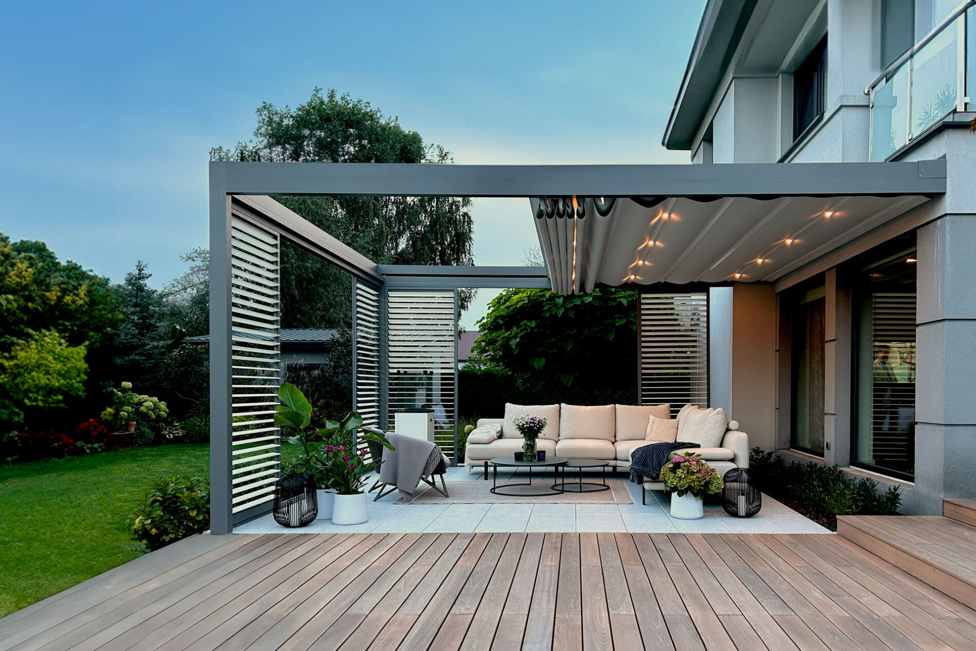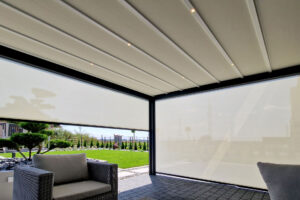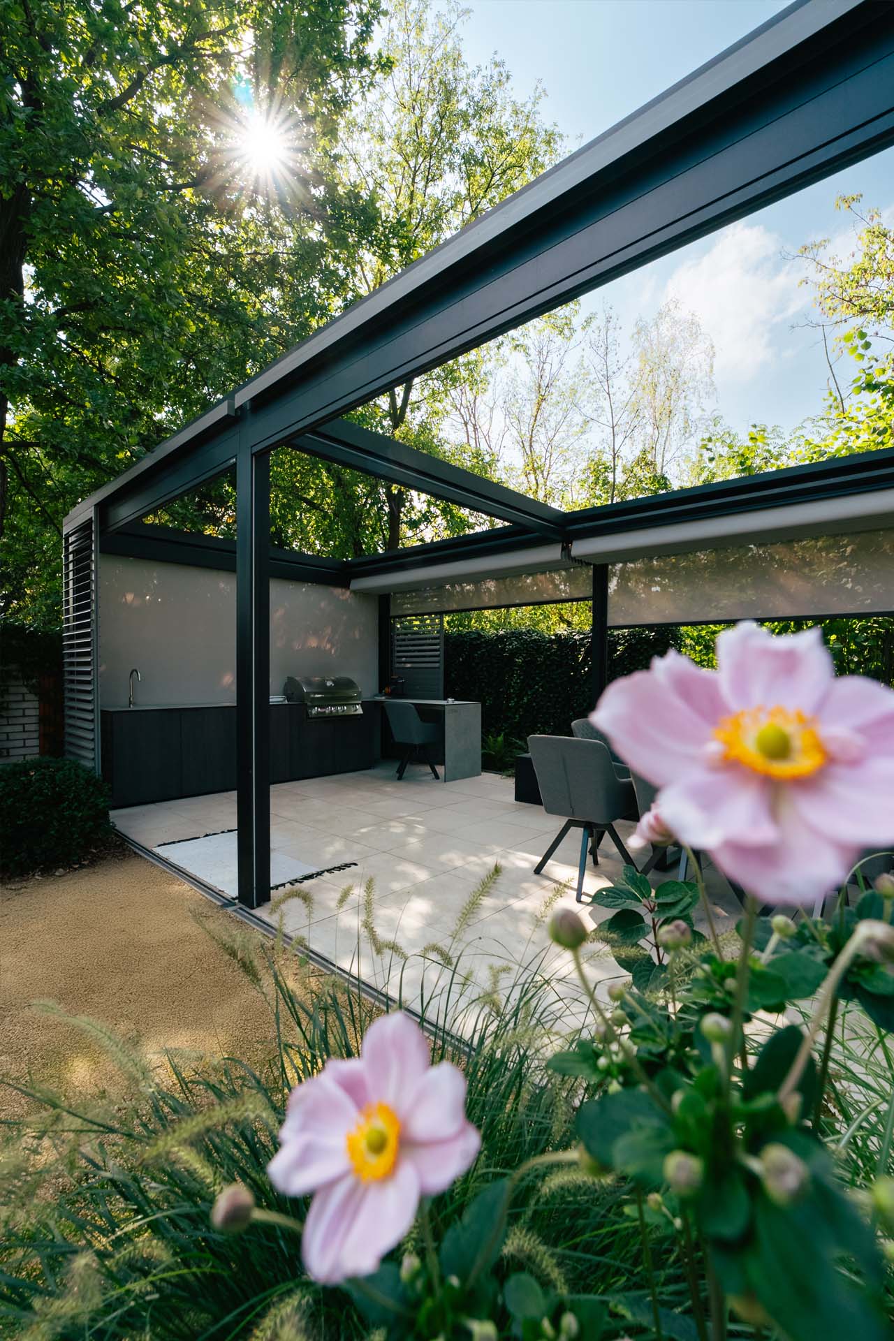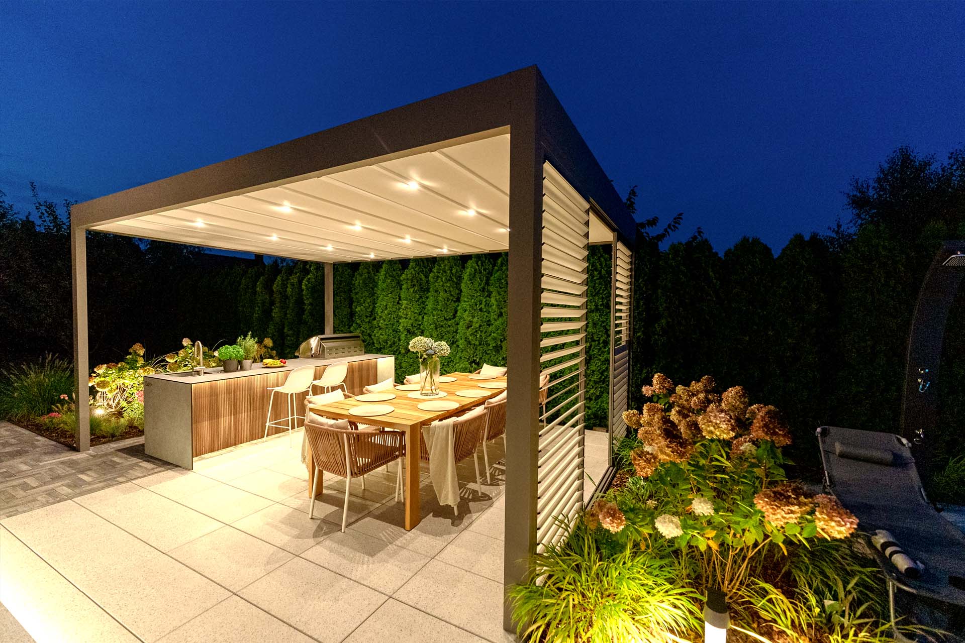 Górna warstwa ma na celu skuteczną ochronę, dolna zapewnia estetyczne wykończenie. Obie warstwy można otworzyć, aby cieszyć się nieograniczoną przestrzenią. Prosta, kubiczna forma świetnie wpisuje się w nowoczesny styl architektoniczny, a możliwość rozbudowy modułowej odpowiada na potrzeby branży HoReCa. Sprawdzi się jako pawilon w ogrodzie, przedłużenie domowego salonu czy zadaszenie w opasce betonowej.