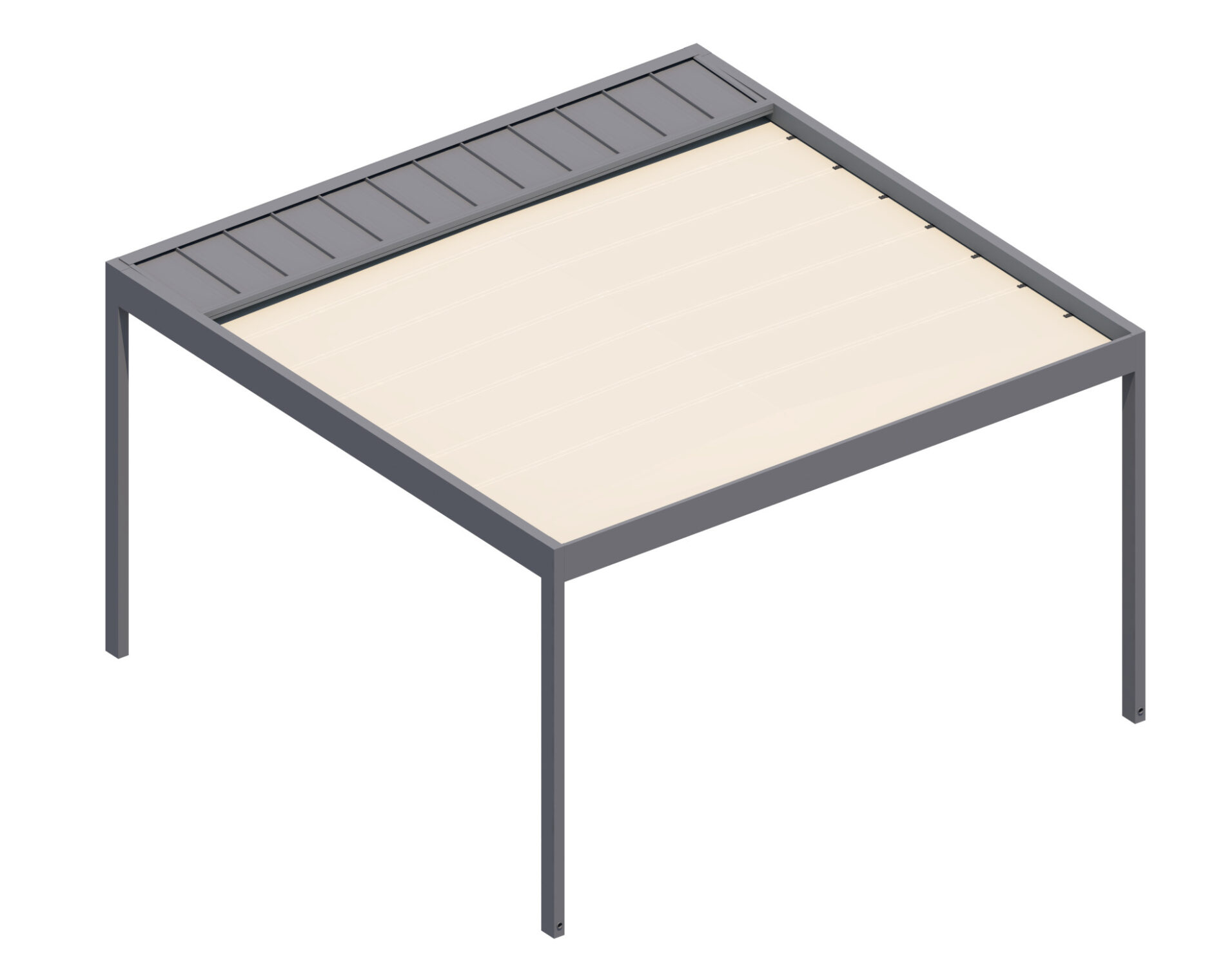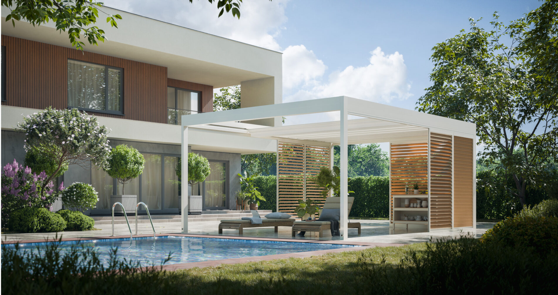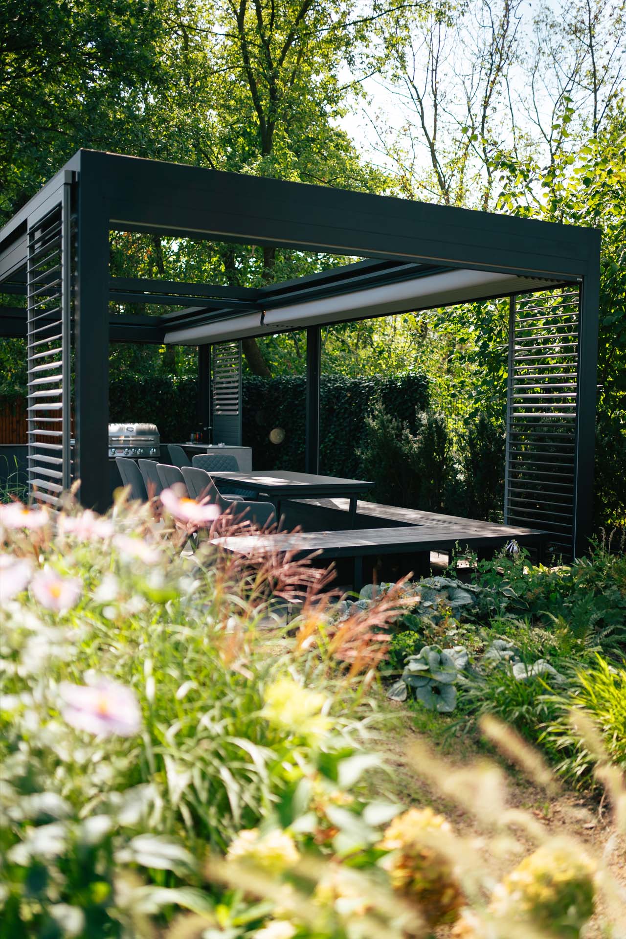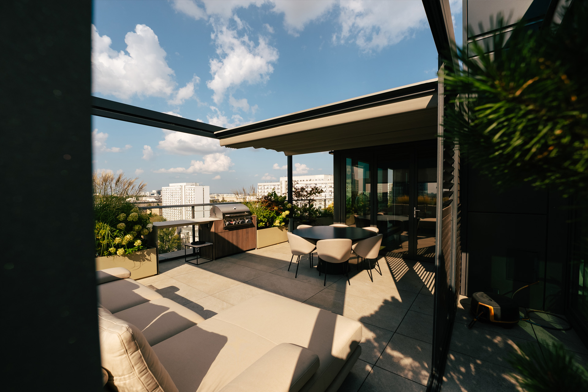Górna warstwa ma na celu skuteczną ochronę, dolna zapewnia estetyczne wykończenie. Obie warstwy można otworzyć, aby cieszyć się nieograniczoną przestrzenią. Prosta, kubiczna forma świetnie wpisuje się w nowoczesny styl architektoniczny, a możliwość rozbudowy modułowej odpowiada na potrzeby branży HoReCa. Sprawdzi się jako pawilon w ogrodzie, przedłużenie domowego salonu czy zadaszenie w opasce betonowej.