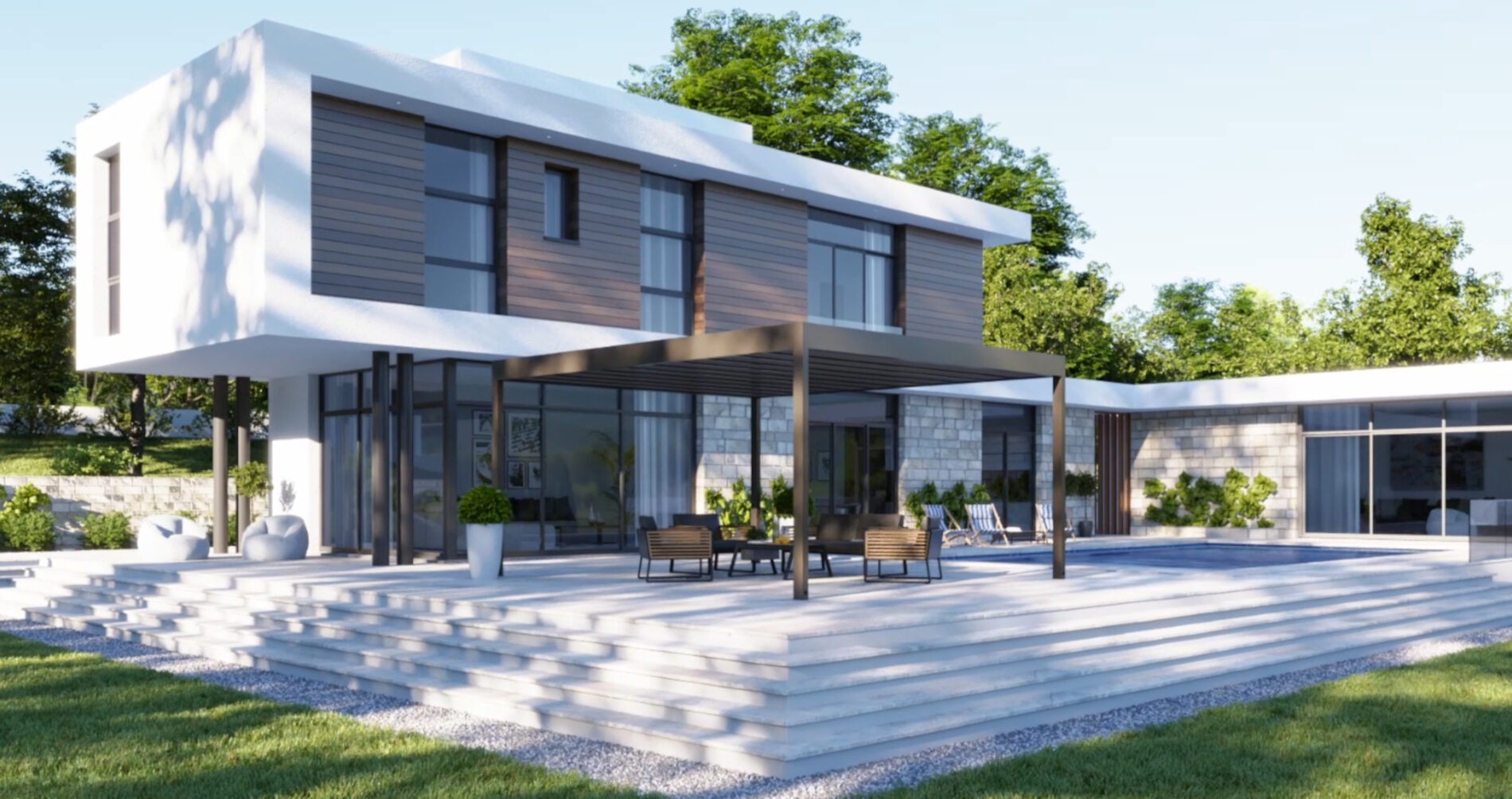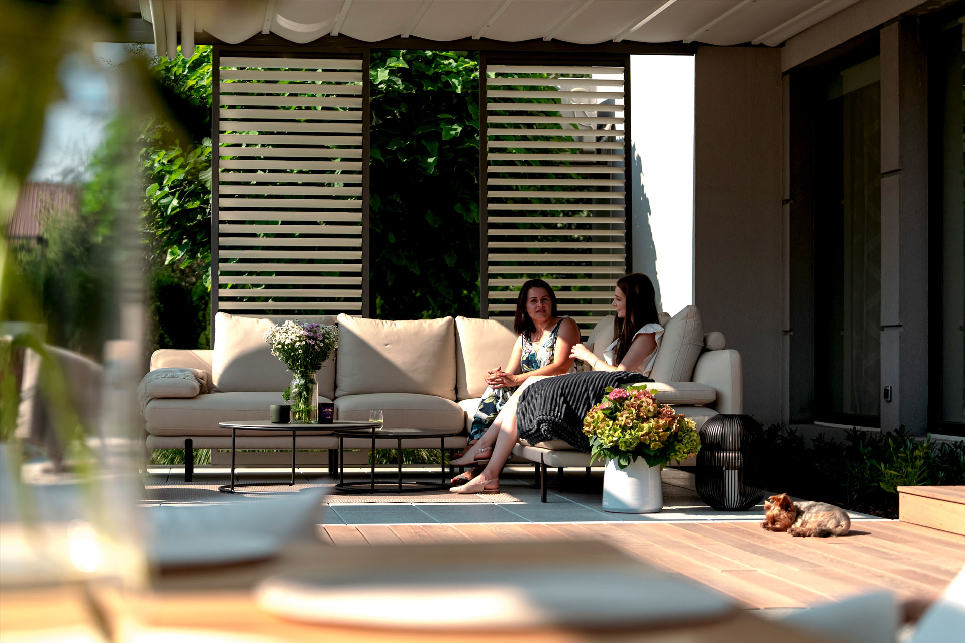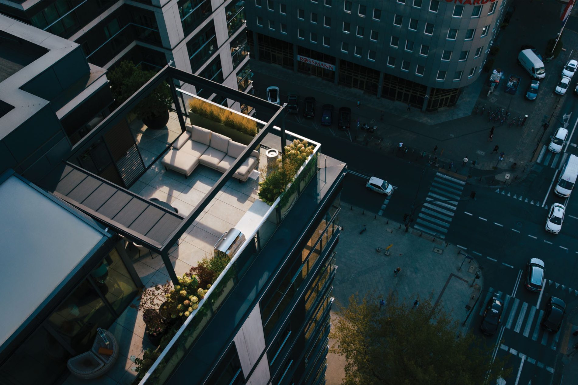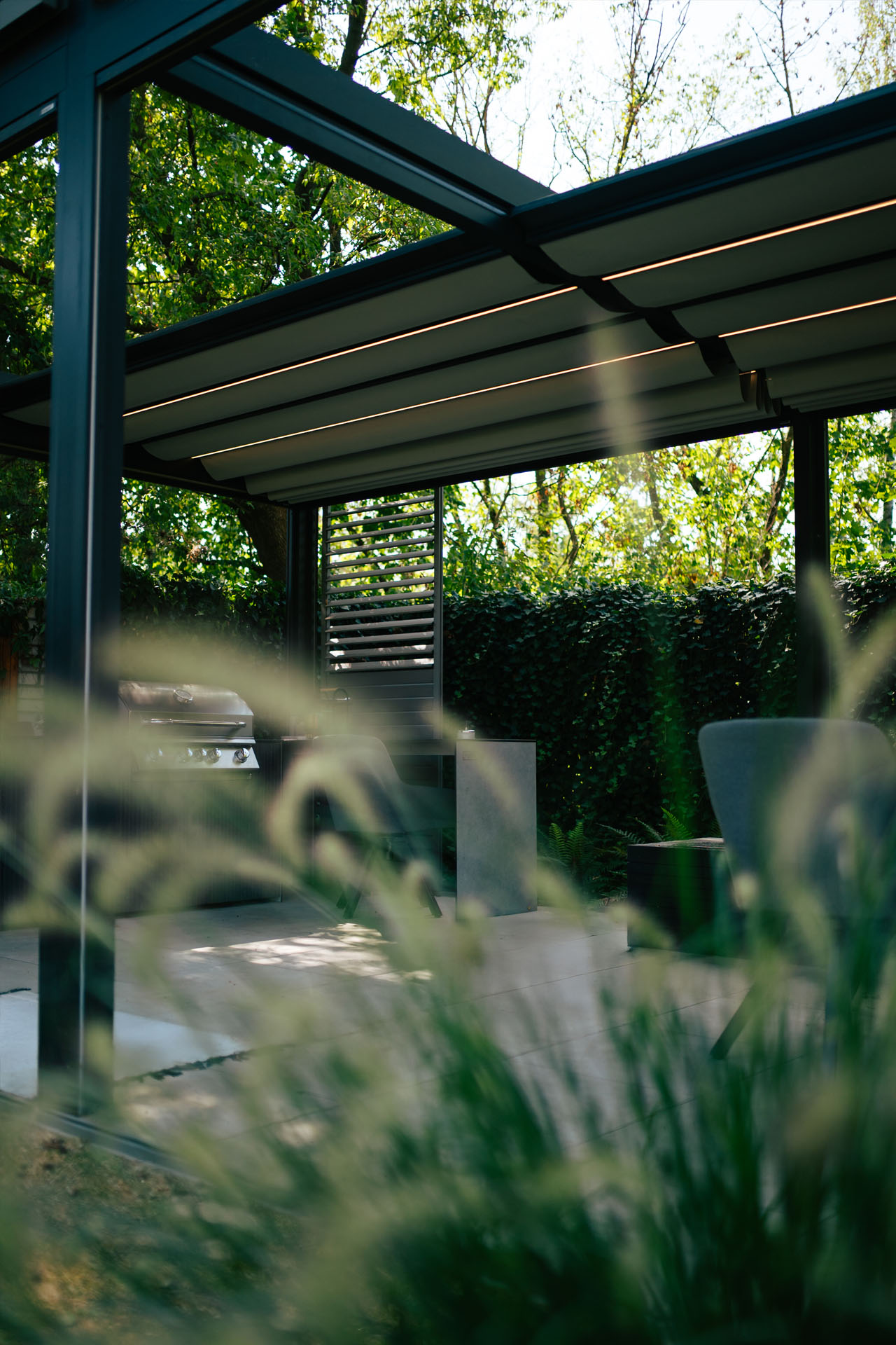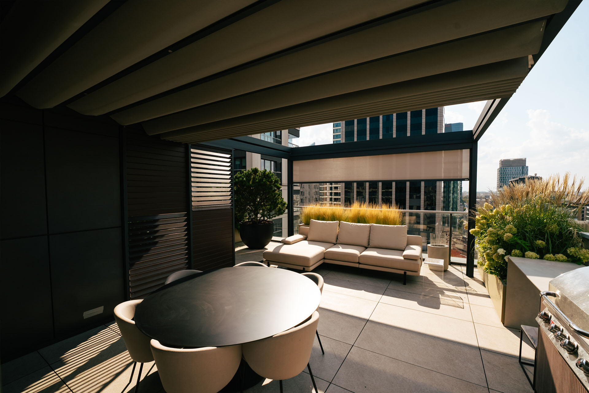 Górna warstwa ma na celu skuteczną ochronę, dolna zapewnia estetyczne wykończenie. Obie warstwy można otworzyć, aby cieszyć się nieograniczoną przestrzenią. Prosta, kubiczna forma świetnie wpisuje się w nowoczesny styl architektoniczny, a możliwość rozbudowy modułowej odpowiada na potrzeby branży HoReCa. Sprawdzi się jako pawilon w ogrodzie, przedłużenie domowego salonu czy zadaszenie w opasce betonowej.