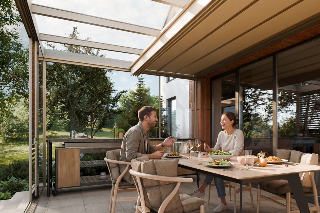 Przesuwna tkanina zapewnia komfortowy cień wtedy, gdy go potrzebujesz, ale nie rezygnujesz z zalet transparentnego zadaszenia.